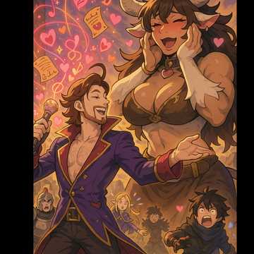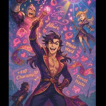 Groovy power metal with comedic NSFW fantasy flair, Style: High-energy guitars with funky chug riffs, neoclassical solos, and punchy drums, Vocals are playful, dramatic male leads with occasional spoken lines and exaggerated flair, Features slap bass grooves, organ stabs, and rhythmic breakdowns, Lyrics are cheeky, innuendo-packed, and magical—following a bard who buffs his party using lewd, enchantment-based songs, Music has strong stage-theatrical flair with dynamic shifts between swaggering verses and explosive choruses, Think heavy metal meets magical burlesque chaos, Add moaning SFX and layered harmony chants during climaxes, Song ends with a flashy solo and dramatic fadeout