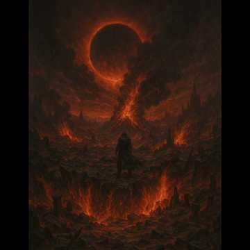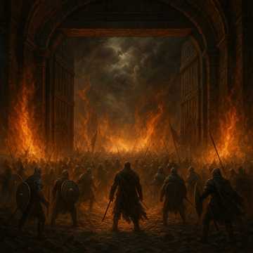 Swedish death metal | layered guitars | drop tunings | dark melodic phrasing | tremolo picking | harmonized leads | crushing rhythm chugs | galloping riffs | slow cinematic intro | escalating chaos | fire and battle theme | heavy low-end distortion | reverb-soaked bends | ambient dissonance | intense double kick drums | blast beats | battlefield atmosphere | haunting feedback | minor key progressions | heroic yet doomed melodies | ash-covered soundscape | wailing solos | aggressive chord shifts | cinematic war march | harmonic layering | tempo surges | brooding to furious energy curve | sorrowful fadeout | instrumental storytelling | no vocals | thunderous basslines | tension-building harmonics | expressive slides and bends | guttural sound wall | thunder crack rhythm breaks | searing lead tone | dread-evoking clean guitar intro | epic melodic arcs
