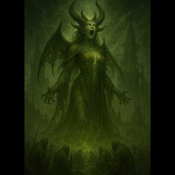 A mythic fusion of blackened deathcore, industrial horror, and demonic ritual soundscape, Female vocals roar with unholy conviction—guttural, possessed, and layered with banshee shrieks and corrupted whispers, Guitars tear through drop E with chaotic tremolo runs, dissonant harmonic dives, and relentless chug patterns that fracture reality, The track mutates constantly, collapsing in on itself like a ritual gone wrong, Hellfire FX, reversed chanting, and boiling textures create a sound that feels alive, screaming, and wrath-born, This is not a song—it’s a cursed summoning