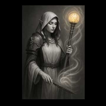 Melodic death metal fused with futuristic ambience, Guitars tuned to Drop C with sharp, articulate tone—tight rhythm chugs paired with neoclassical harmonies and soaring leads, Dual vocals (clean + growled) layer over punchy double-kick drums and deep, resonant bass, Synths shimmer beneath the mix, evoking a sci-fi world, The song tells of an elf cast into a world of steel and spirit, where magic evolves through metal, It’s both brutal and ethereal—a clash of nature and machine told through melody, heaviness, and celestial atmosphere