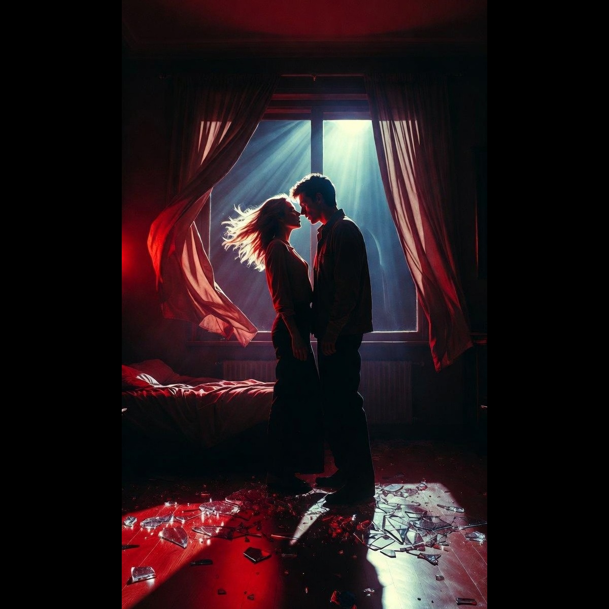 Dark dramatic latin alternative rock duet with moody spanish rock atmosphere, Powerful distorted electric guitar riffs with melodic lead phrases and atmospheric delay, deep bass groove and driving tom-heavy rock drums, Seductive female vocal and rough passionate male rock vocal alternating verses, explosive passionate duet choruses with intense emotional tension and slow burning dramatic rock build