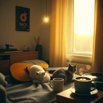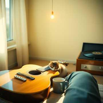 Ambient Folk, Lo-fi Indie, Think "a spontaneously composed memory", Mood: Contemplative, gently joyful, deeply peaceful, intimate, grateful, quiet, human-scale, Vocal: A single, soft MALE voice intimacy, Breathy, close, intimate, The delivery is a mix of melodic humming, spoken whispers, and half-sung phrases, It should feel like thinking aloud, not performing, Slight smile in the tone, Instrumentation & Improv Feel: The core is a gently fingerpicked acoustic guitar with a warm, muted tone felt pick for softness, A soft, freestyle piano motif that provides a hypnotic anchor, Textural layers: the faint crackle of a vinyl record, very subtle ambient synths, A soft, breathy flute and melancholic clarinet that enters occasionally, like a fleeting happy thought, No drums, only the natural rhythm of the picking, Production: Ultra-dry, intimate, "ear-to-the-soundhole" closeness, Prioritize the tactile sounds of fingers on strings, the breath before a phrase