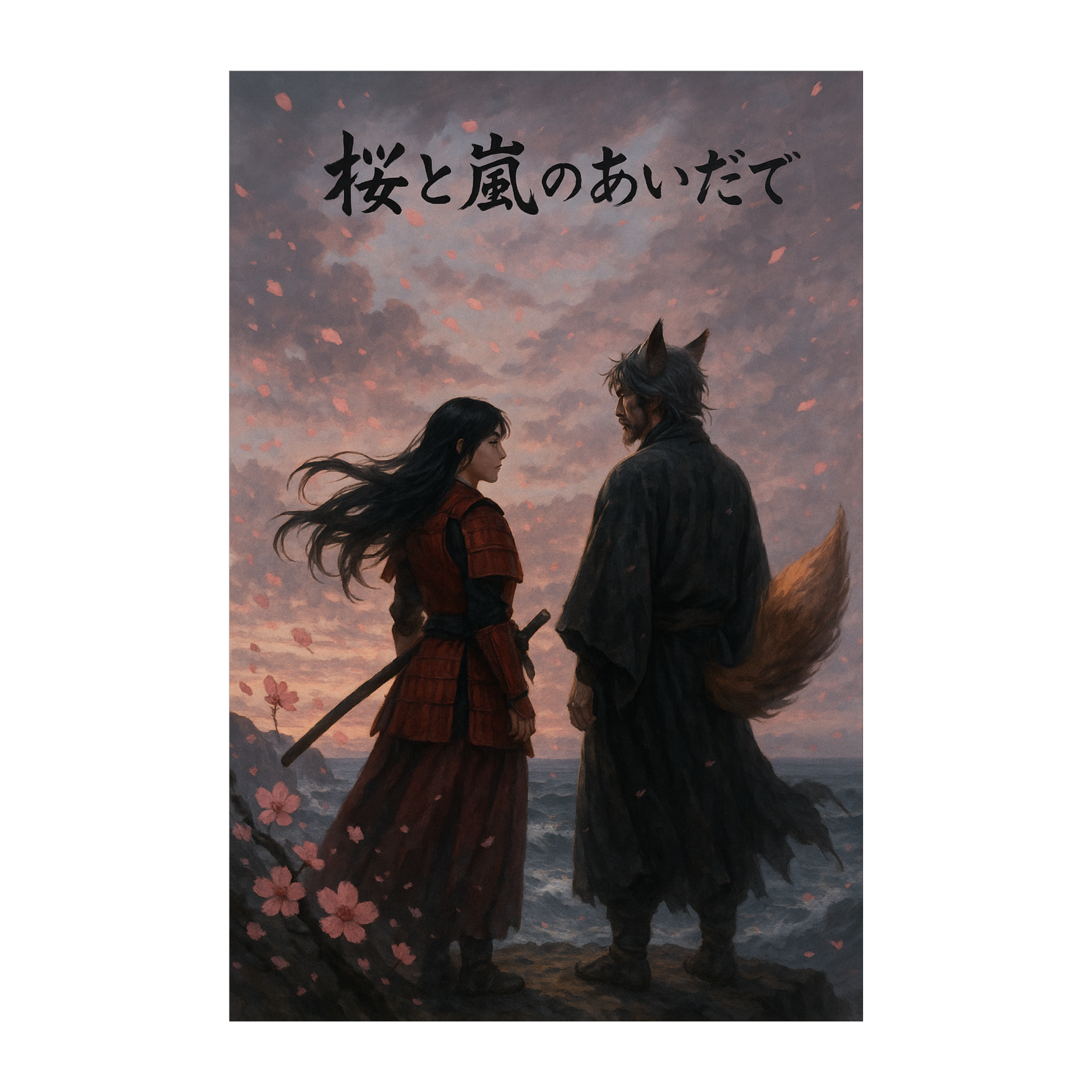 Create a Japanese J-Rock / J-Pop hybrid song with traditional samurai music influences, Blend emotional electric guitar and soft synth layers with shamisen, koto, and taiko drums, The lyrics are entirely in Japanese and tell a poetic story: an older Wandering Samurai and a lone onna-bushi (female warrior) stand together at a stormy seaside cliff, The older wandering Samurai thanks her for hearing his voice, and they both find peace in the wind and falling cherry blossoms, The mood should be melancholic, powerful, and cinematic — like an ending theme of an anime about honor, loss, and connection, Vocal style: emotional Japanese female vocal, soft but strong, similar to Aimer or LiSA, Tempo: 86 BPM, Length: about 3 min 30 sec