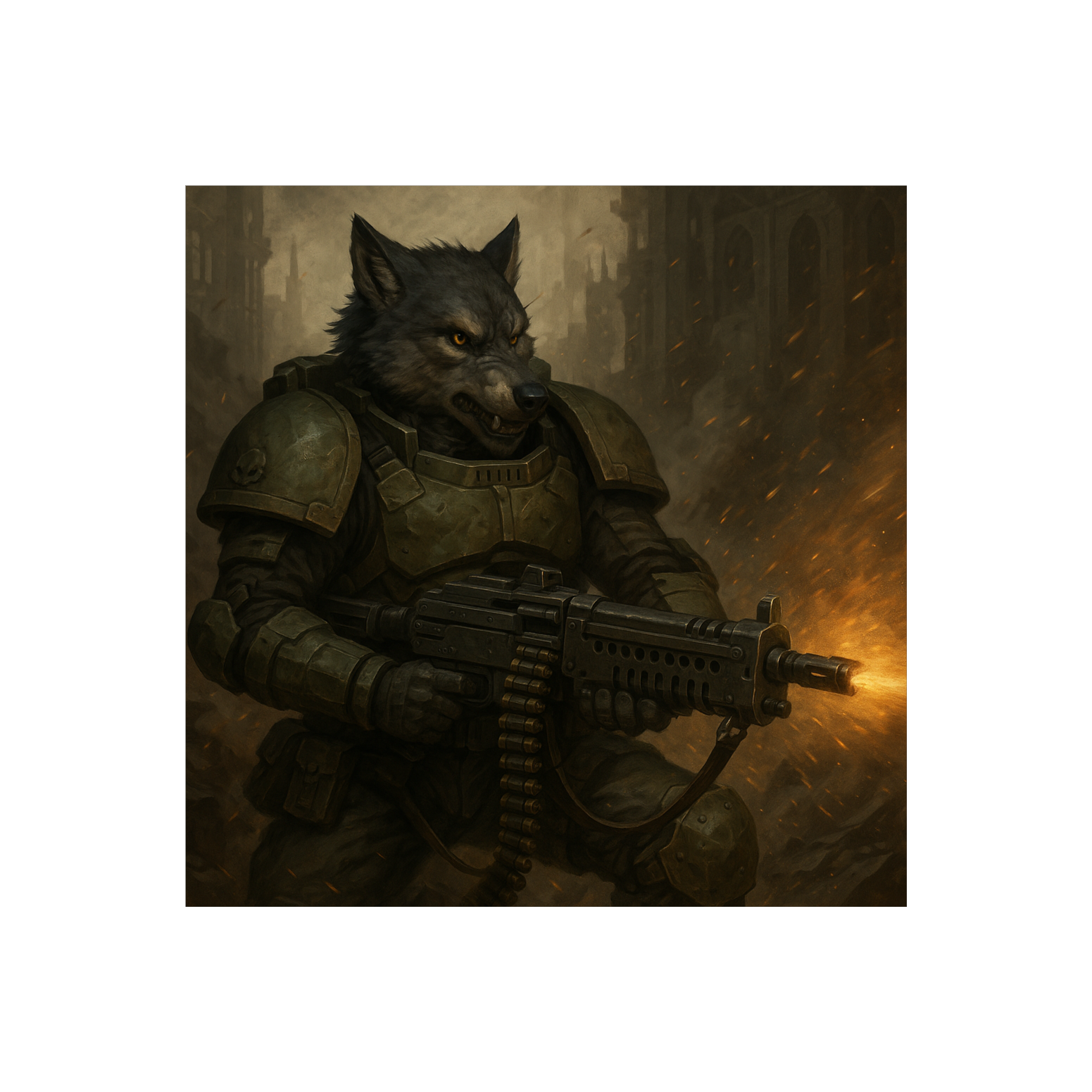 [Industrial heroic metal march with deep male vocals, heavy drums, machine-gun rhythm, metallic ambience and choir accents, Theme: a wolf-soldier defending the Imperium amid fire and ruin, Warhammer 40K inspired, ]