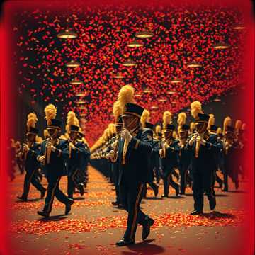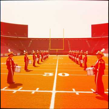 Two separate 90 second marching band drumline cadences separated by a four count marching snare hard count, then another four count separating the cadences from a triumphant, flamboyant college marching band style fight song