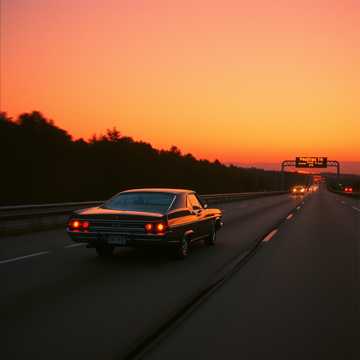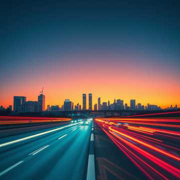 Warm evening skyline, bustling streets, neon reflections, steady motion, calm productivity