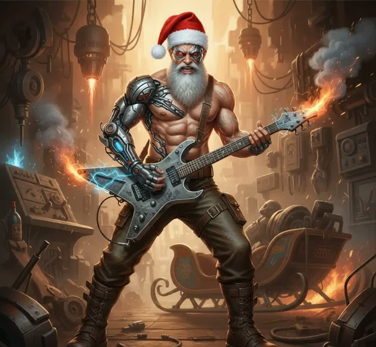 death metal, thrash metal, industrial metal, cinematic sci-fi war music, mechanical guitar riffs, heavy industrial drums, epic orchestral elements, dark futuristic atmosphere, Male vocals, deep and commanding, harsh aggressive verses, clean epic chorus, industrial vocal effects, subtle distortion and reverb, backing male choir, death metal, rich harmonies, progressive drums, storm, soaring chorus, vibrant, chaotic sound
