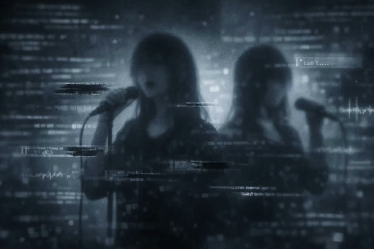 Two female vocalists, layered vocals, vocal harmonies, melodious, passionate performance, instrumental harmonies, superb sound, new era music, powerful kick drum, techno, piano and violin concerto