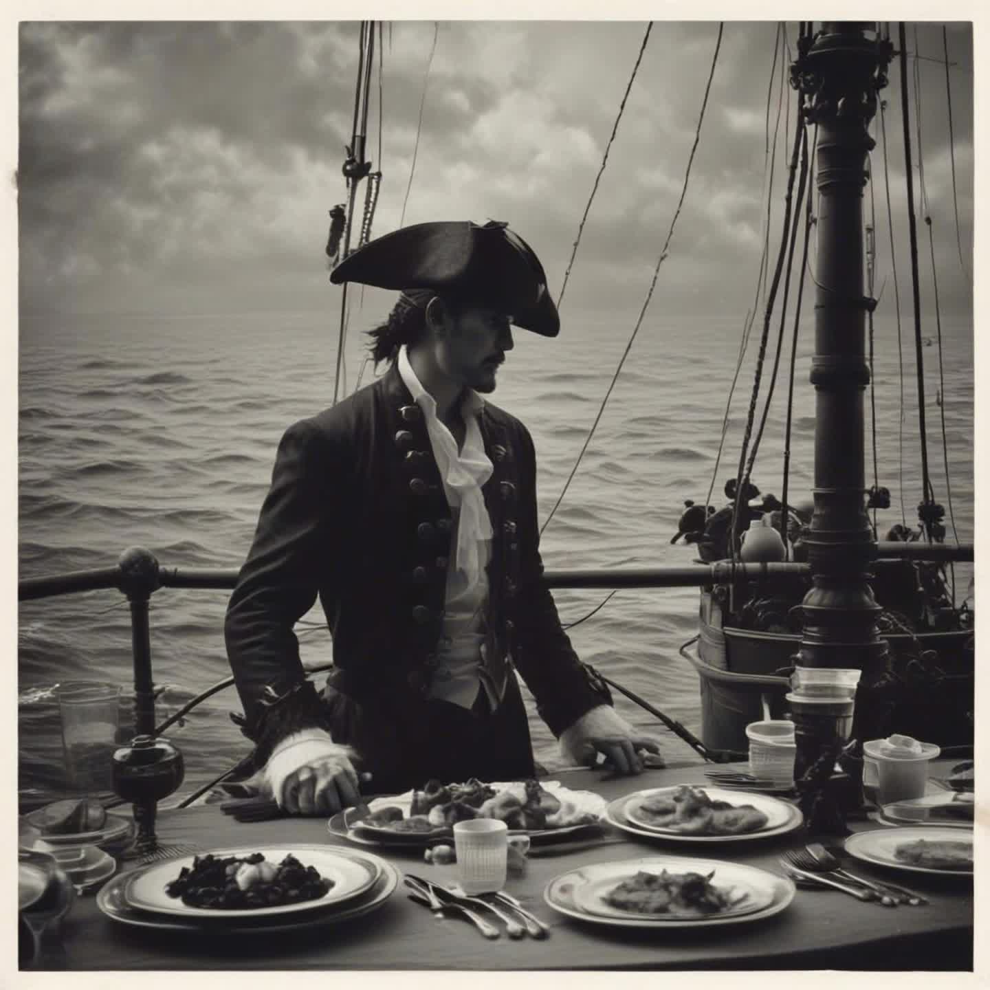 A rowdy, upbeat pirate-themed Irish folk-punk song, blending traditional Irish instruments (fiddle, tin whistle, Irish flute, uilleann pipes, bodhrán, accordion, concertina, banjo, Irish bouzouki, and Celtic harp) with punk rock energy — fast-paced distorted electric guitars and punk drums, Gritty, raspy Irish male vocals, singing in a traditional pirate style, Add immersive pirate sound effects like drunken cheers, clashing swords, cannon fire, shipboard noises, and mug slams on wooden tables, The song ends by slowing down dramatically during the final chorus, which uses altered lyrics, and fades slowly into silence for a cinematic, melancholic finish