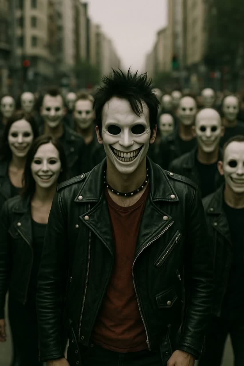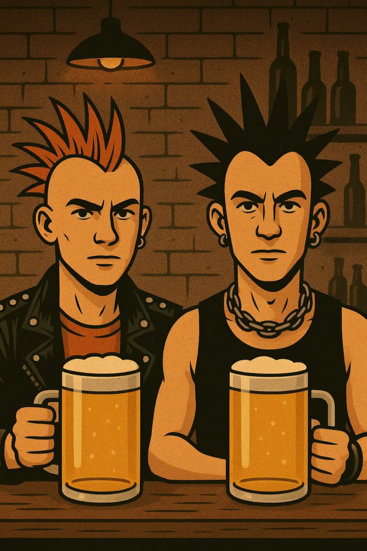 Fast upbeat punk rock, pop punk song, Tempo 160 BPM, Fun, energetic, rebellious mood, Two male vocals: main lead and second voice for powerful shout-along backing vocals, Strong gang vocals in chorus, loud “hey!” style call-and-response, tight harmonies, Distorted punk guitars, driving bass, aggressive fast drums, simple catchy melody, Youthful street punk vibe, joyful and sarcastic tone