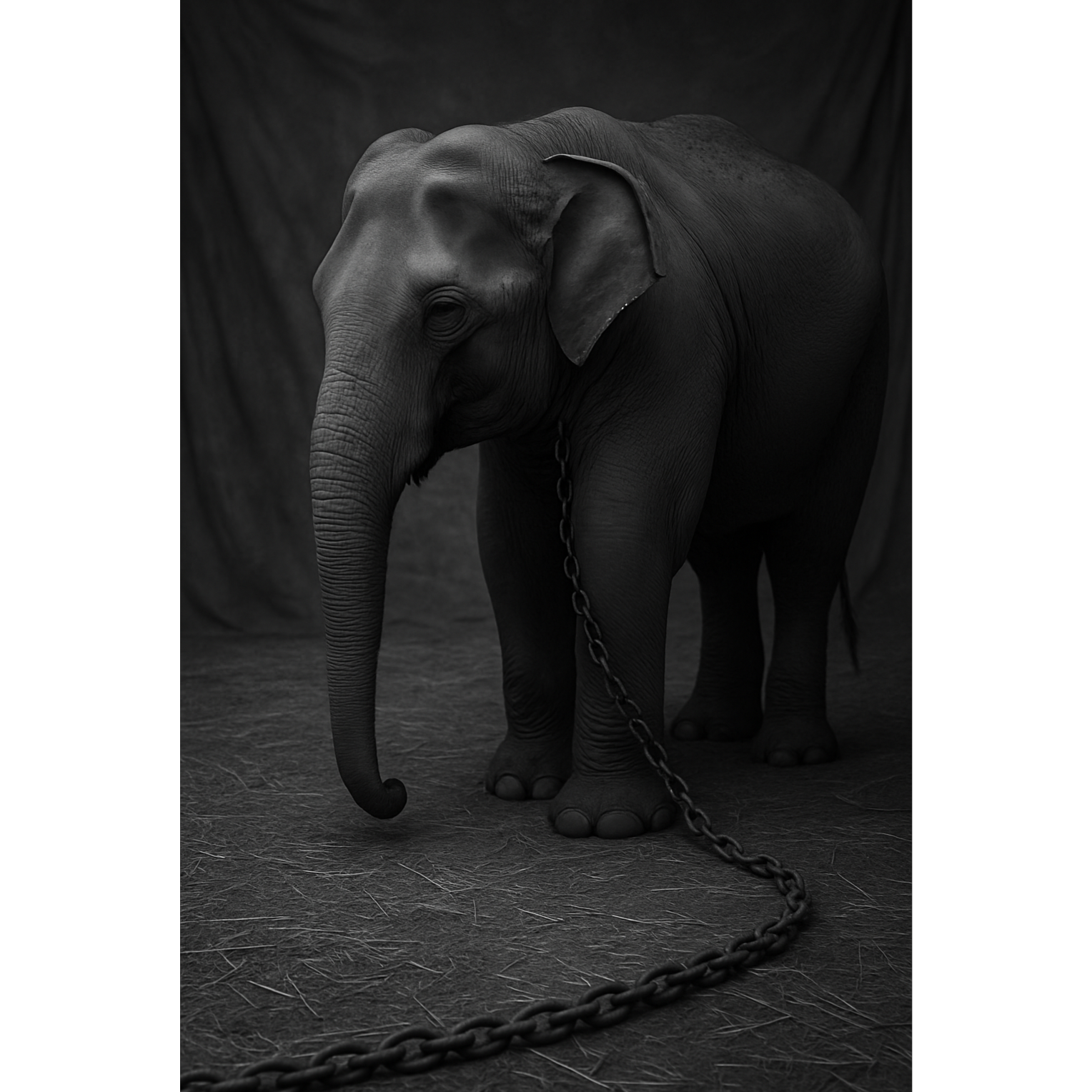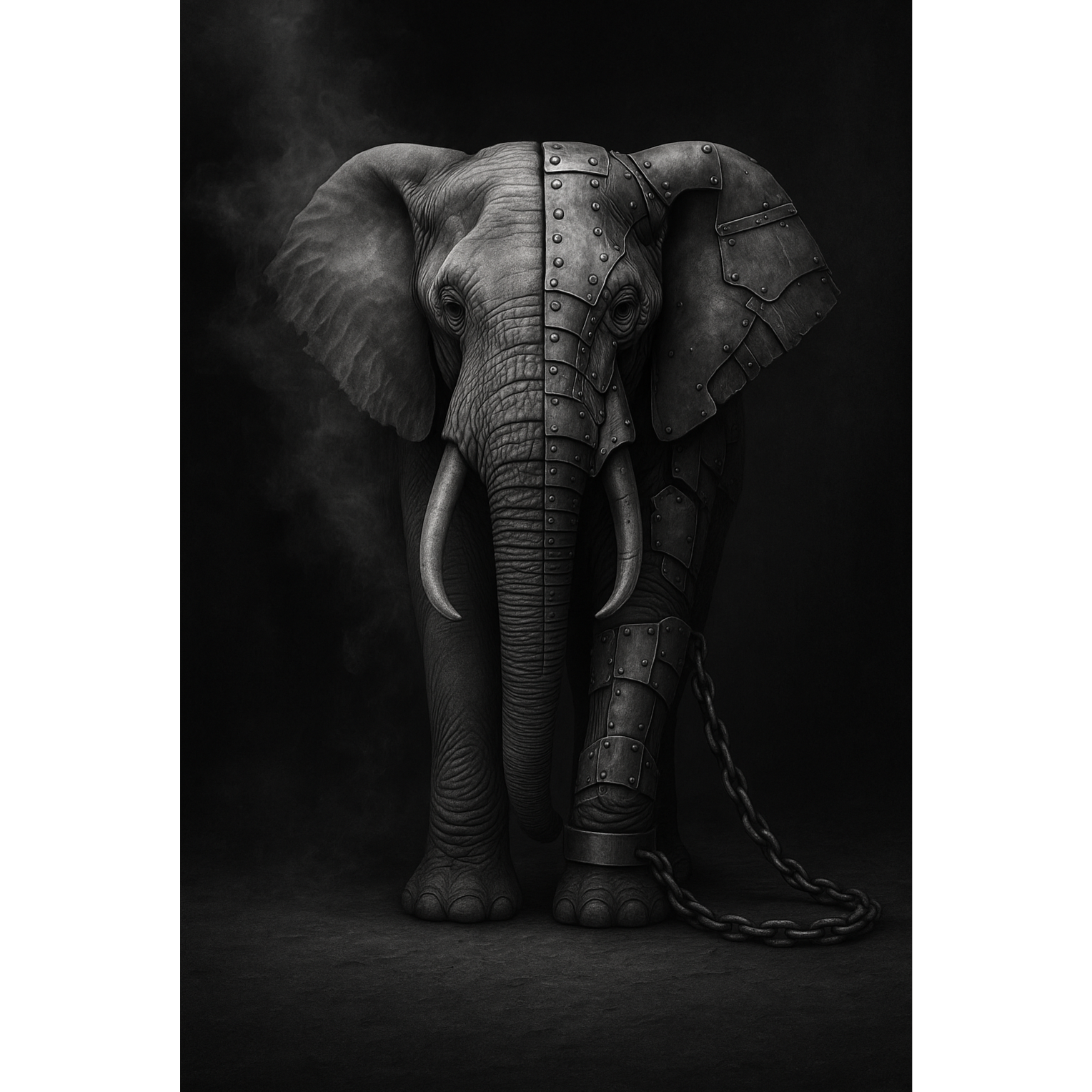 Lo-fi trip-hop in minor key with industrial edge, Vinyl crackle and cassette hiss, Sparse fingerpicked acoustic guitar loop, repetitive and hypnotic, Deep sub-bass with metallic resonance, Marching industrial percussion: heavy, mechanical, steady like chained footsteps—clanks, low thuds, metallic scrapes, Muted trumpet lines drift in, mournful and distant, adding late-night jazz tension, Atmosphere: dense, heavy, unresolved, like a secret carried too long, Vocals: male voice, very low and gravelly, spoken-sung in an intimate late-night style, Detached, mantra-like phrasing—syllabic, clipped, step by step, Refrains repeat with layered whispers and distorted echoes, building density, Noise textures creep in—distant machinery hum, chains dragging, metallic drones, Final refrain thick with layered voices, percussion pounding like an elephant march, Outro fades into trumpet echo, metallic hum, vinyl crackle, and silence