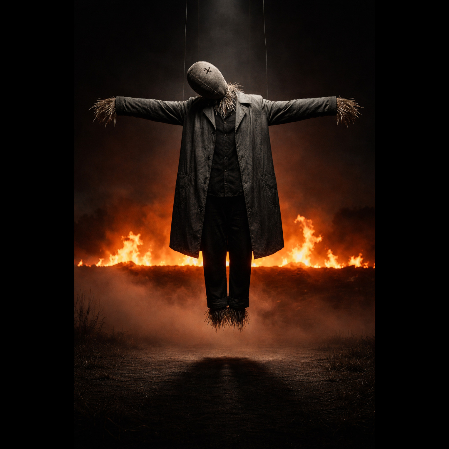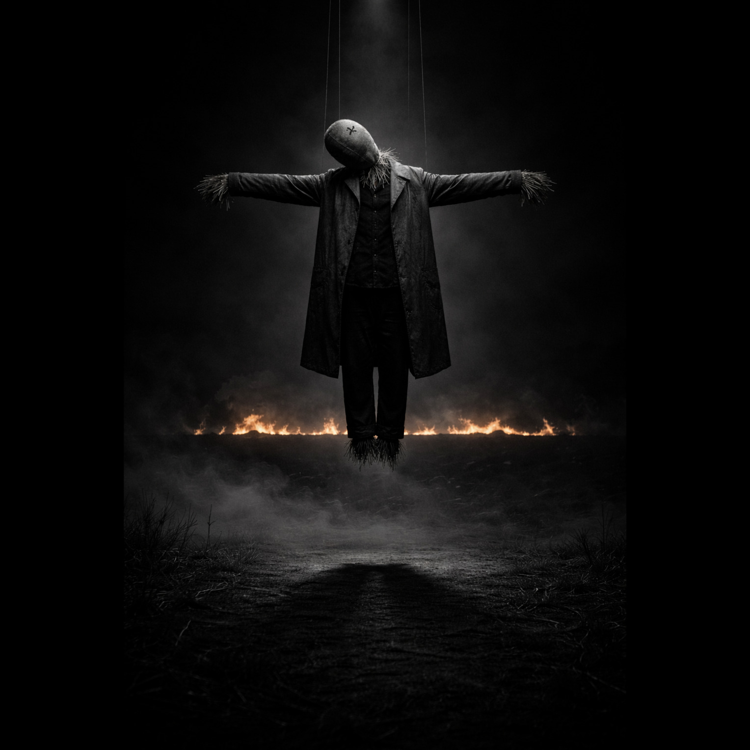 Downtempo trip-hop, minor key, atmospheric and hypnotic, Vinyl crackle intro, sparse fingerpicked guitar loop, deep sub bass, brushed trip-hop drums, Gravelly low spoken-sung male vocal, mantra-like chorus with ghostly whispered counter-lines and layered harmonies, Texture builds with metallic percussion, eerie Rhodes chords, and swelling strings in the bridge, Dark, oceanic atmosphere—like rocking in a stormswept hull, Outro decays with vinyl crackle, distant foghorn tone, mantra whispered into silence