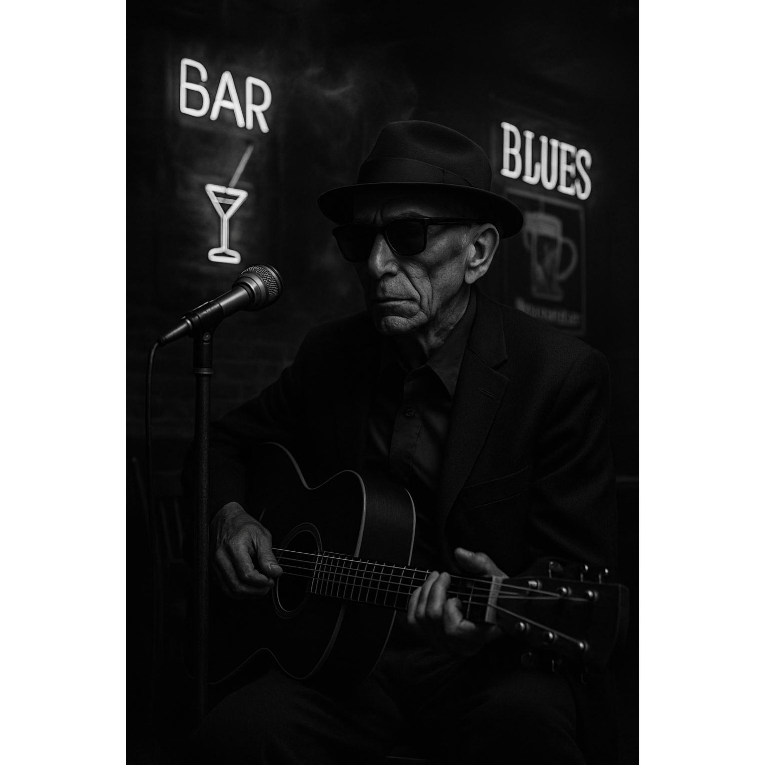 Downtempo trip-hop blues with fingerpicked acoustic guitar loop, vinyl crackle, deep bass, brushed drums, Male vocal, very low and gravelly, spoken-sung in an intimate late-night style, Minor key, smoky and atmospheric, reverb-drenched harmonies