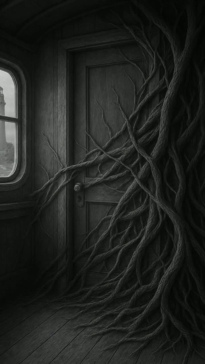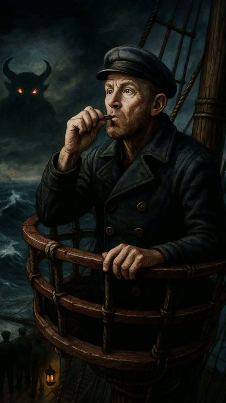 Dark Lovecraftian sea shanty, slow 6/8 rhythm, deep gravelly male vocal with ghostly crew chorus, Bowed bass, low drum, creaking timbers, and distant haunting whistle, Cinematic nautical folk horror with mournful atmosphere and rising dread