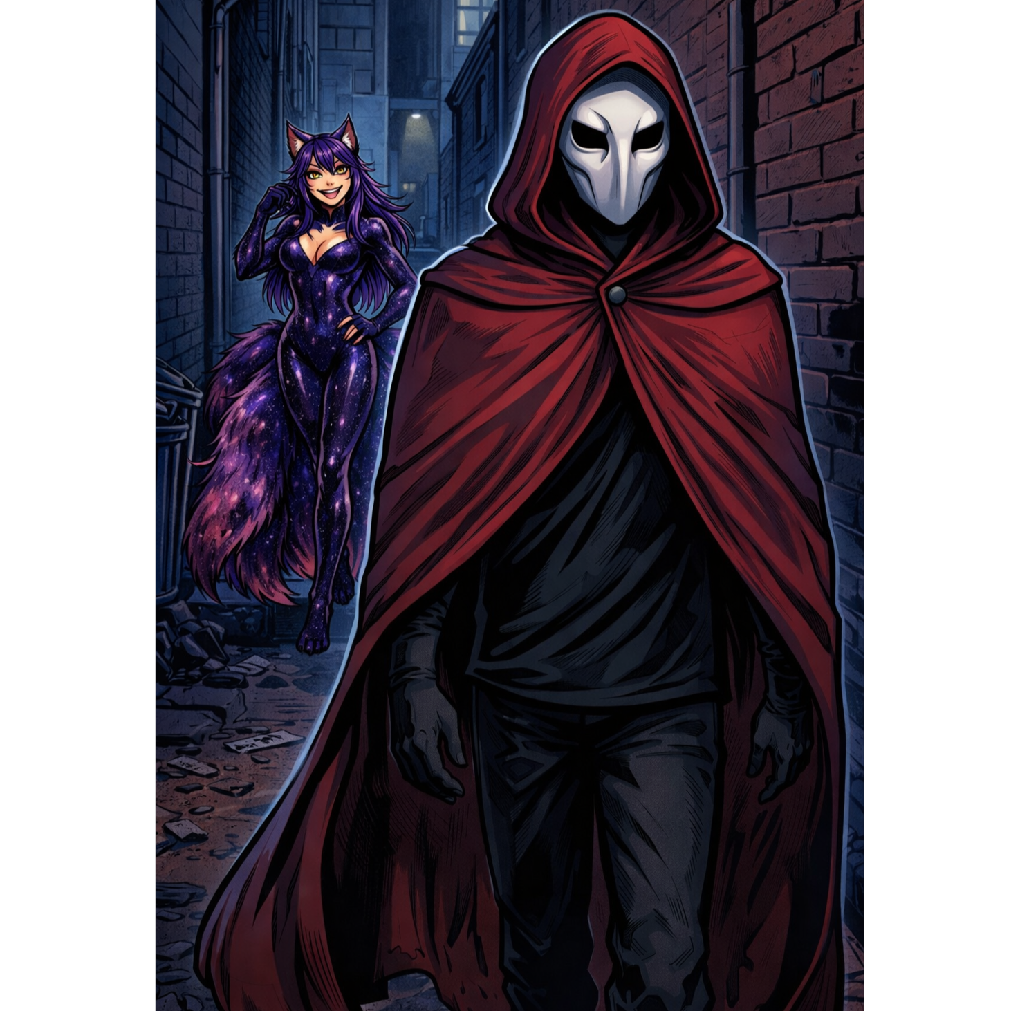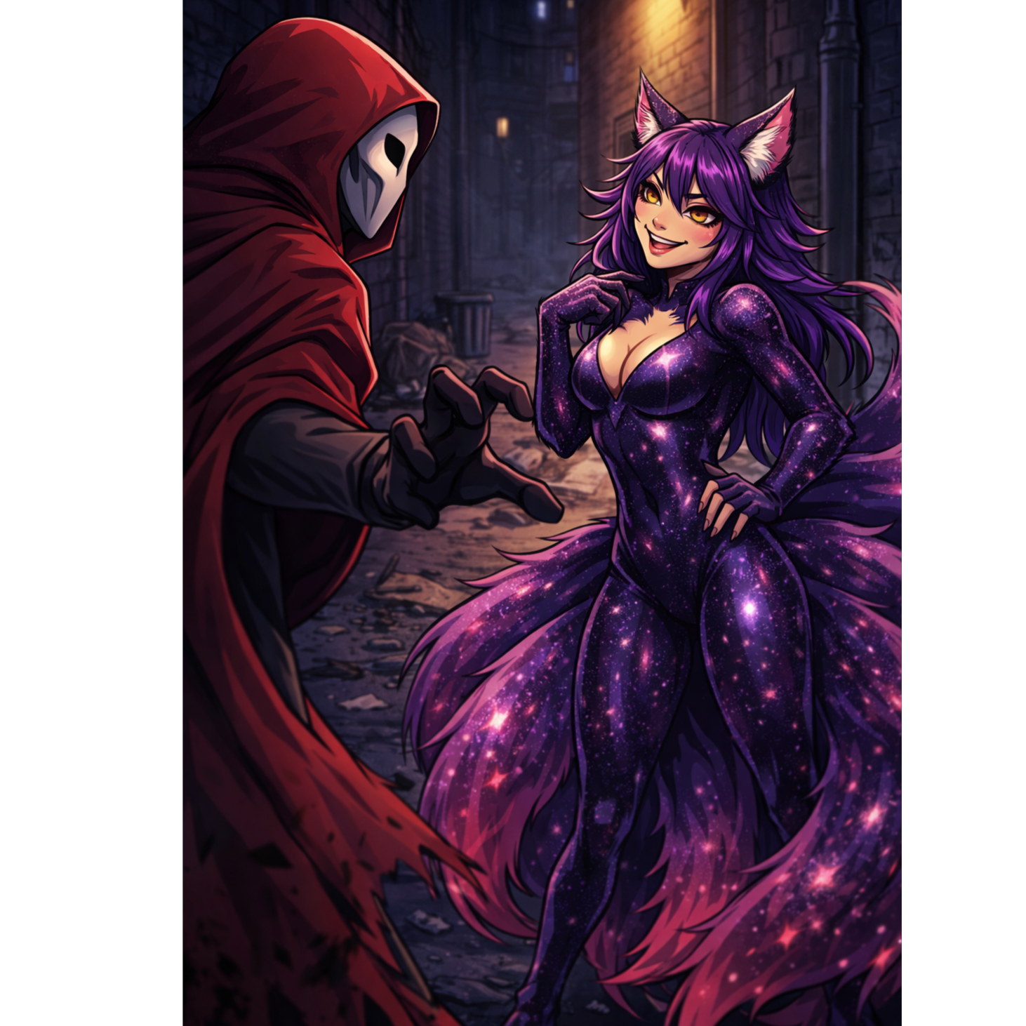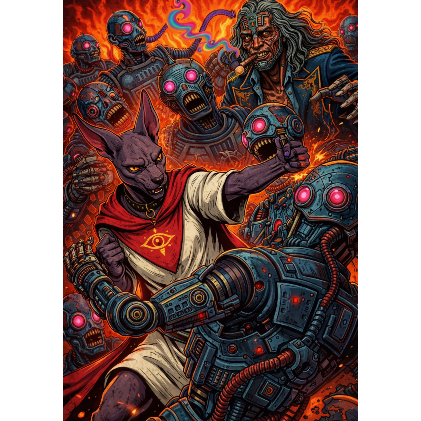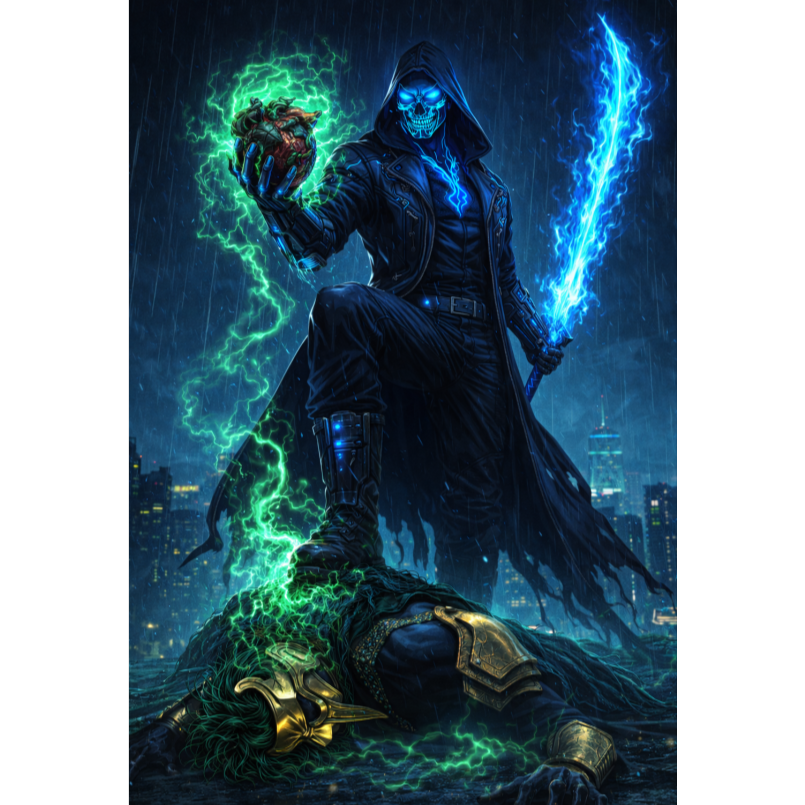 Dark, aggressive villain-themed nerdcore rap with trap-metal and horrorcore influences, Ominous, cinematic atmosphere built on minor-key melodies, distorted 808 bass, industrial percussion, and tense, menacing synths, Hard-hitting modern trap drums with sharp hi-hats and punchy kicks, Vocal delivery is deep, commanding, and threatening, alternating between confident rap verses and explosive, shouted or growled emphasis lines, Lyrics convey dominance, corruption, rage, power, and psychological intimidation, written from the perspective of an unstoppable antagonist or anti-hero, High energy, confrontational tone with dramatic pauses and drops to enhance impact, Production should feel heavy, dark, and polished, suitable for anime villains, boss battles, or cinematic confrontations, No pop elements; prioritize intensity, grit, and raw power, Mood is malevolent, ruthless, and unstoppable, blending rap swagger with metal aggression and horror aesthetics