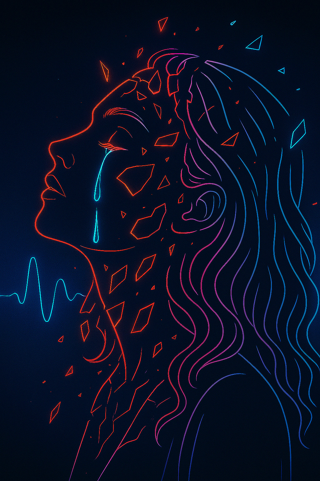 Cyber Rock / Industrial EDM / Dark Pop Fusion; tempo 132 BPM; key A minor; crystal-clear but aggressive vocal, slightly overdriven; production loud, sharp, high-contrast; hybrid of distorted electric guitars, glitch synths, and heavy electronic drums; rhythm section punchy with gated reverb snares and mechanical kick; verses minimal guitar riff + sub bass with tense intimate vocal; pre-chorus rising filter sweep and metallic percussion; chorus explosive with wall-of-sound guitars, detuned synth leads, cyber distortion, and side-chained sub; bridge half-time with ambient pad + whispered lines then erupting into a massive guitar-driven drop; post-bridge solo bleeding electric guitar with glitchy modulation and feedback; final chorus full hybrid rock-EDM chaos, layered harmonies, and saturated master; outro distorted piano + fading feedback; mix wide, loud, ultra-clean, cinematic power and emotional intensity