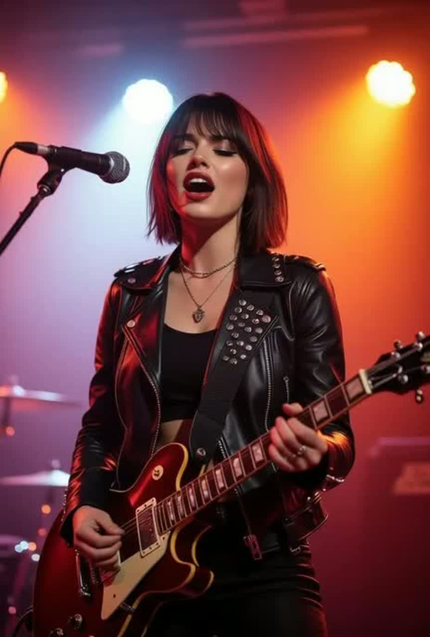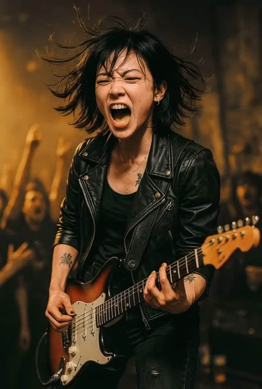 Create a cinematic hard-rock track with a powerful female vocal — emotional, warm, slightly broken, Sound must be clear, wide, and intense: violent energy with dreamy psychedelic tension, Start with screaming dual-tracked Gibson Les Paul guitars (Mesa Dual Rectifier) and full DW drum blast, Add Fender Jazz Bass (overdriven, compressed) and expressive Neumann U87 vocals with vibrato and raw emotion, Chorus: quad-tracked guitars, aggressive snare, full drums, layered harmonies, subtle Mellotron pad for width, Bridge/Solo: long psychedelic Stratocaster solo with delay, reverb, phaser, rotary echo — evolving from melodic to chaotic feedback over rolling toms and ambient pads, Outro: violent band crash fading into sustained feedback, Mix: studio clarity, tight low end (~60 Hz), bright guitars (3–6 kHz), crisp cymbals (12 kHz), analog warmth, wide stereo, 98 BPM, Mood: explosive, emotional, transcen