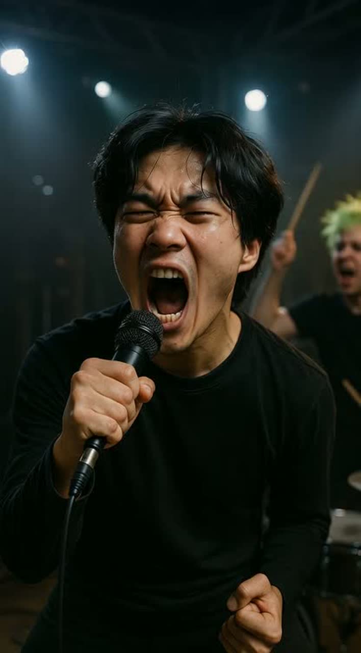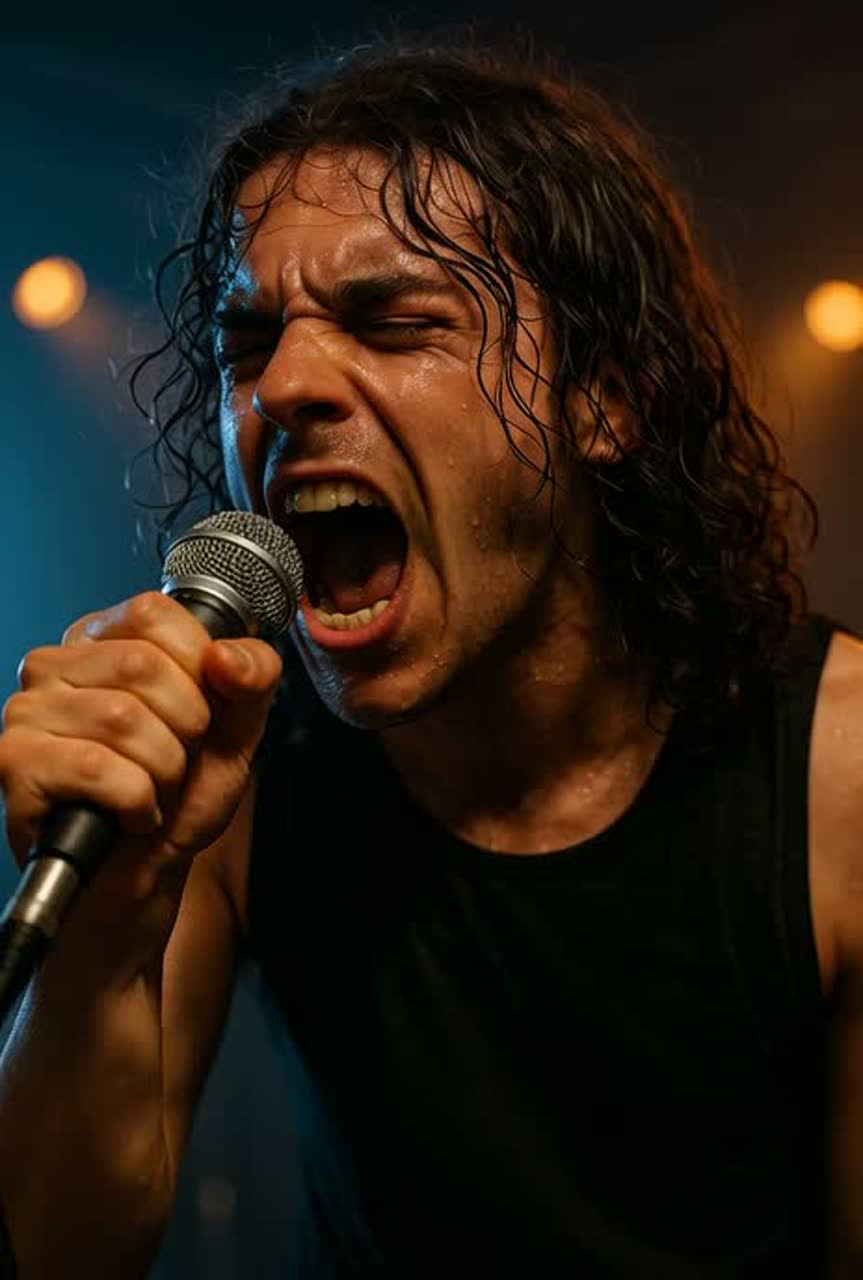 Create a cinematic hard-rock track with a powerful male vocal, raw, warm, broken, Sound must be clear, wide, and intense: violent energy with dreamy psychedelic tension, Start with screaming dual-tracked Gibson Les Paul guitars (Mesa Dual Rectifier) and full DW drum blast, Add Fender Jazz Bass (overdriven, compressed) and expressive Neumann U87 vocals with vibrato and raw emotion, Chorus: quad-tracked guitars, aggressive snare, full drums, layered harmonies, subtle Mellotron pad for width, Bridge/Solo: long psychedelic Stratocaster solo with delay, reverb, phaser, rotary echo — evolving from melodic to chaotic feedback over rolling toms and ambient pads, Outro: violent band crash fading into sustained feedback, Mix: studio clarity, tight low end (~60 Hz), bright guitars (3–6 kHz), crisp cymbals (12 kHz), analog warmth, wide stereo, 98 BPM, Mood: explosive, emotional