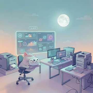 quirky electronic, playful staccato rhythm, soft ambient pads, light office sounds, mischievous office vibe, calm but absurd