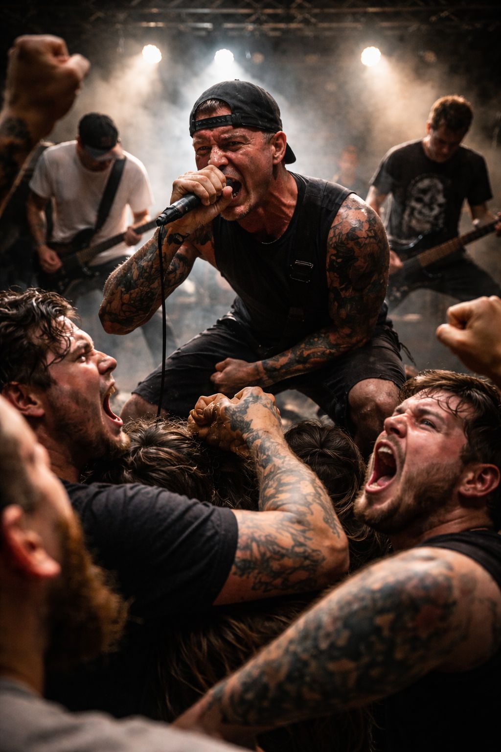 Hardcore punk anthem with raw, aggressive vocals, distorted power chords, and fast-paced drums, Angry lyrics about societal collapse, political corruption, and street rebellion, Chaotic energy, gang shouts, gritty atmosphere, The song explodes with a furious intro, charging guitars and pounding snare, followed by screamed verses about urban decay, protest, and resistance, Chorus is loud, anthemic, with shouted slogans, Bass is gritty, relentless, drums thunder like a riot, Guitar solo is short, noisy, filled with feedback and attitude, Rough production, lo-fi edge, dirty sound, Song ends with sudden stop, like a punch, 1980s UK punk influence, echo of anarchy and street rage, Perfect for a mosh pit, Keep it raw, fast, and loud, No melody polish—just noise, spit, and fury, Make it sound like it was recorded in a live gig, Songs stop in the middle for a fight, then goes back again