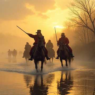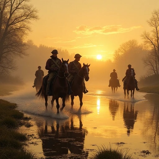 Melancholic folk ballad with light cavalry flavor in 6/8 rhythm, Soft baritone and flugelhorn over fingerpicked acoustic guitar, warm clarinet phrases and rustic accordion swells, Rhythmic but restrained snare drum and muted brass echo distant parades, Inspired by Austro-Hungarian border marches and American Civil War songs, Earthy, nostalgic, and lyrical – a farewell song for riders crossing the river at dawn