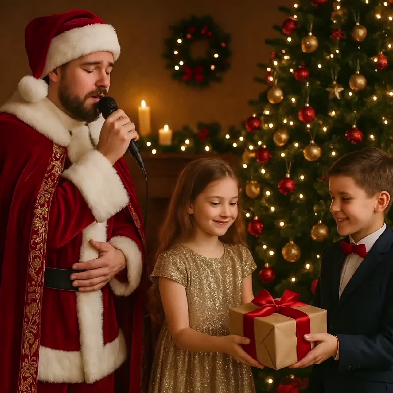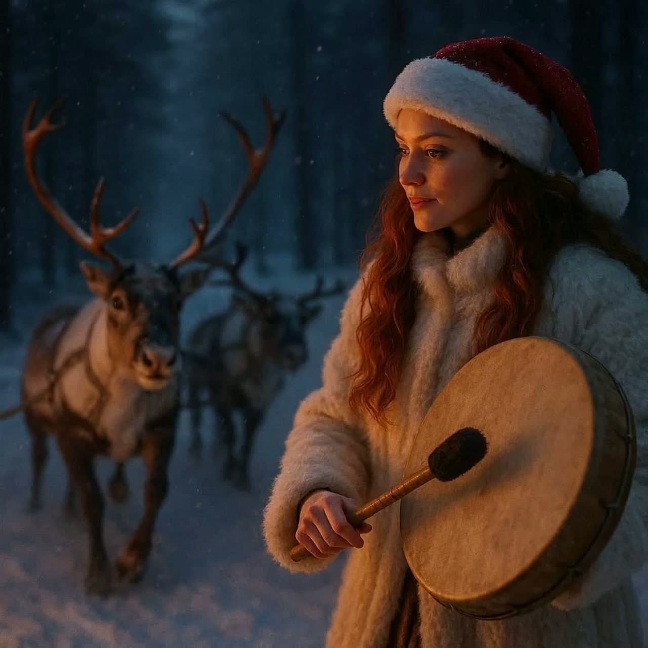 Mystical Christmas atmosphere, Soft tribal drums, deep toms, hand drums, and shakers creating a steady βpa-rum-pum-pum-pumβ pattern, Warm male and childrenβs choir harmonies, snowy ambience, and magical elf whispers, Ethereal, heartfelt, ceremonial, and uplifting