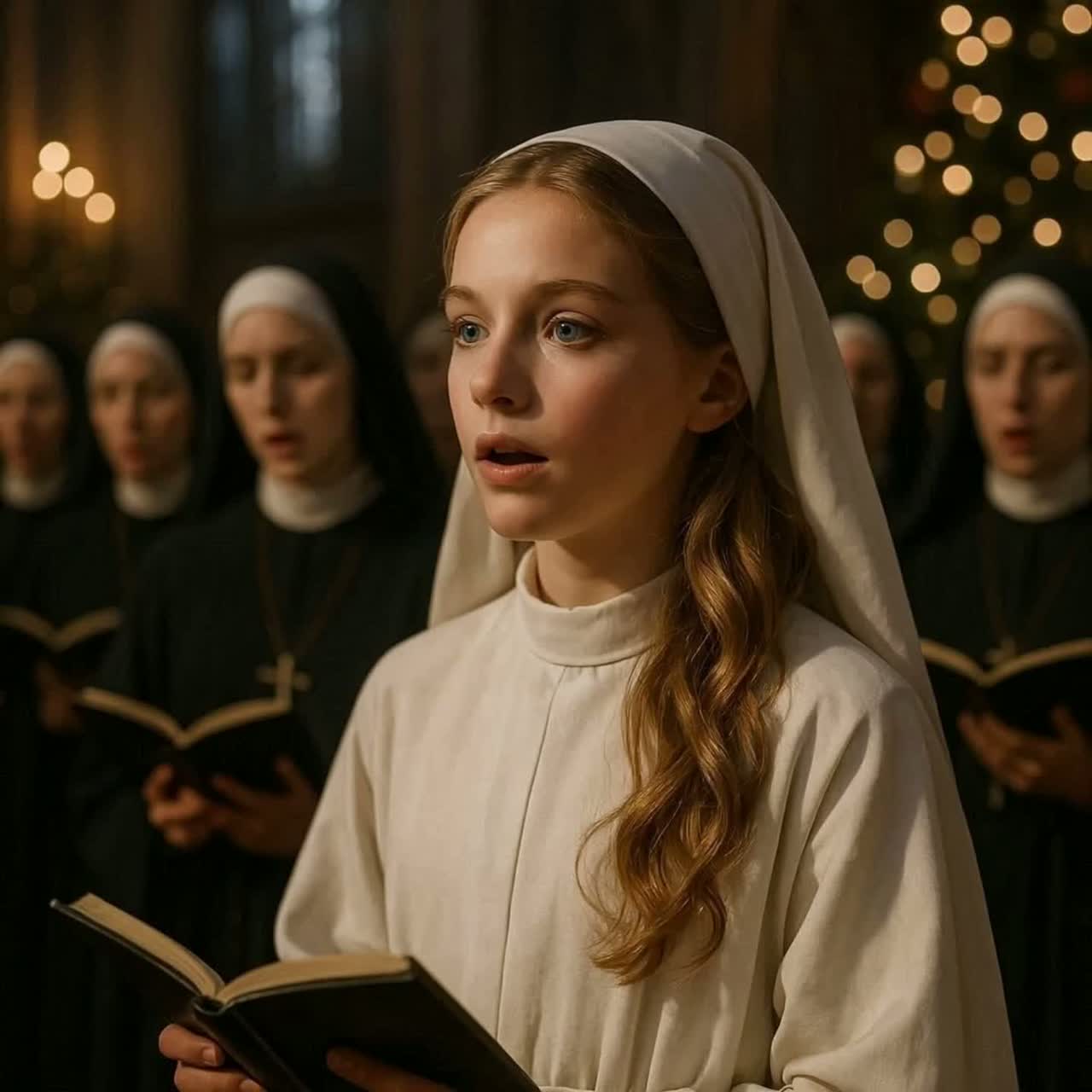 Intimate latin, english Cristmas Carol, Female dreaming indy vocals, with gregorian church choir soft in background, The chorus alternates between Latin phrases and spoken English sung by a male voice