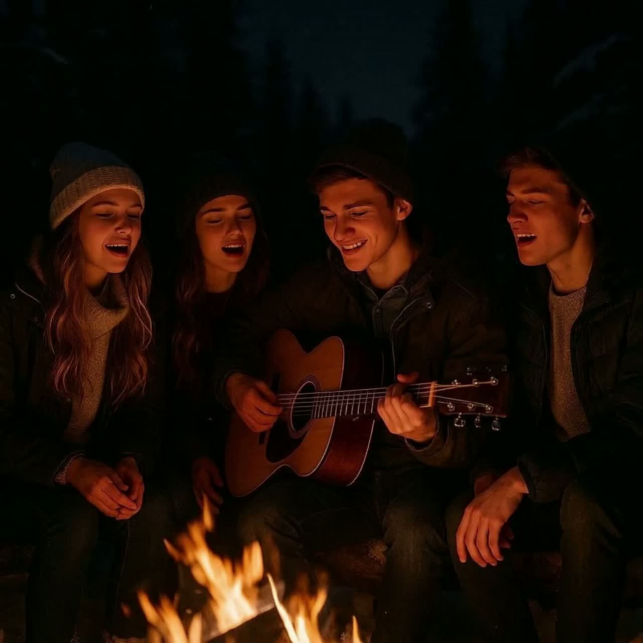 An acoustic folk Christmas song sung by a group of friends sitting around a campfire at night, A deep, warm, slightly raspy baritone male vocal as lead singer, and 2 soul indy breathy female vocals, Gentle acoustic guitar, light percussion, warm vocal harmonies, and the crackle of fire in the background, The song feels intimate, heartfelt, and full of togetherness