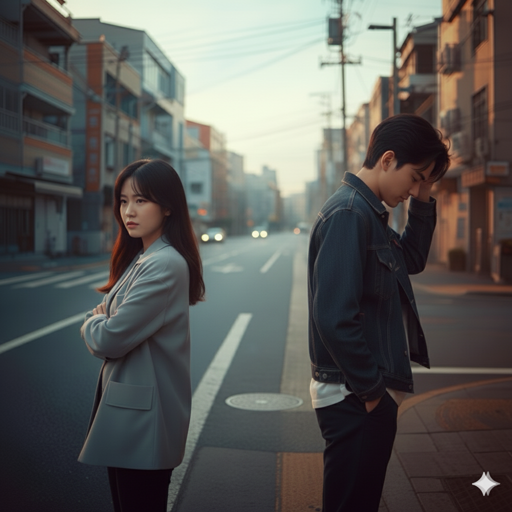 Cinematic modern pop with R&B and electronic influences, Mid-tempo (90–100 BPM), Minimal, tense groove at first, gradually warming toward the end, Cold synths and deep bass in the verses, softer piano and pads in the outro, Male and female vocals, restrained and emotional, Urban, mature, and intimate atmosphere, Theme: near-breaking argument, reflection, and quiet reconciliation, No lo-fi