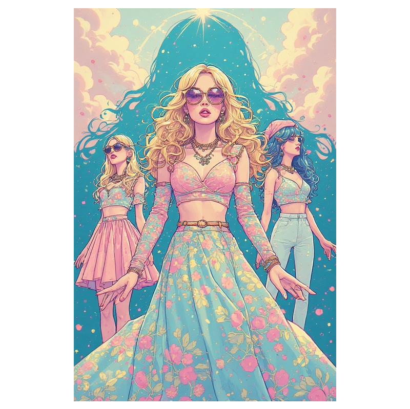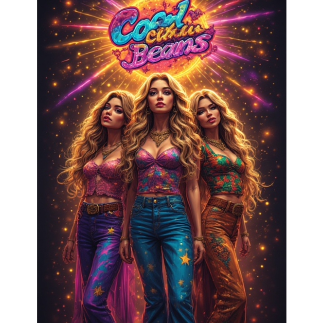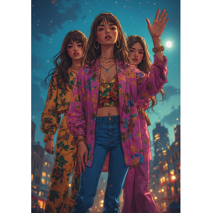 girl group, girl band, pop, dynamic range, a lot of bass, smooth transitions, smooth flow, soft pop, 70's, groovy, disco, uplifting, ethereal