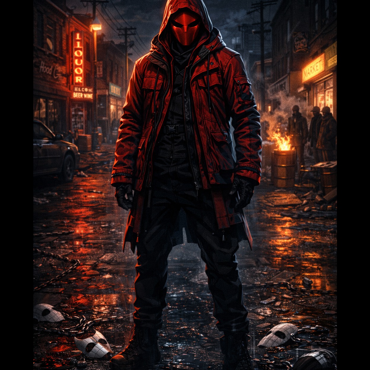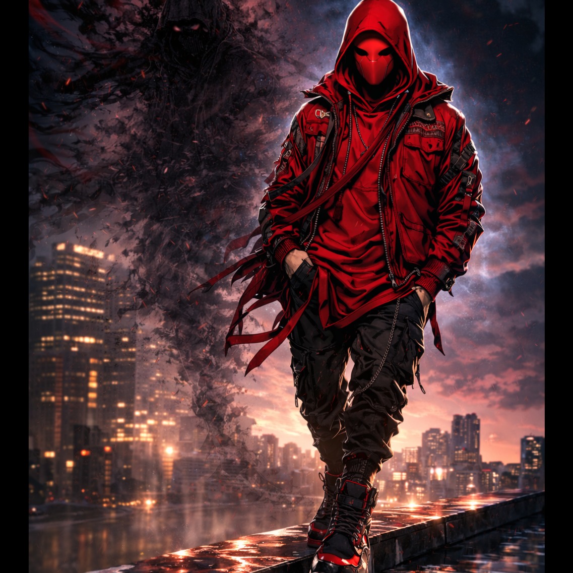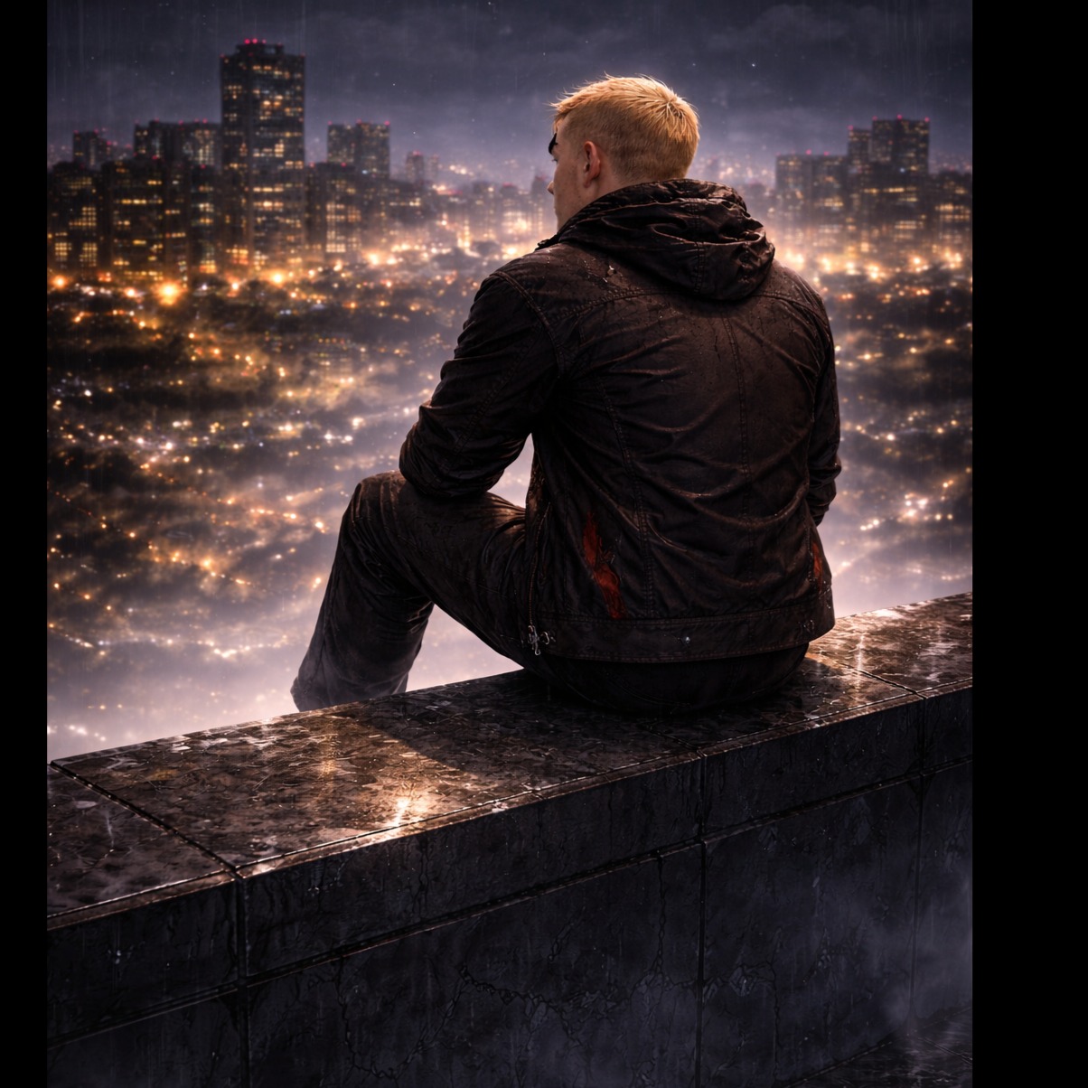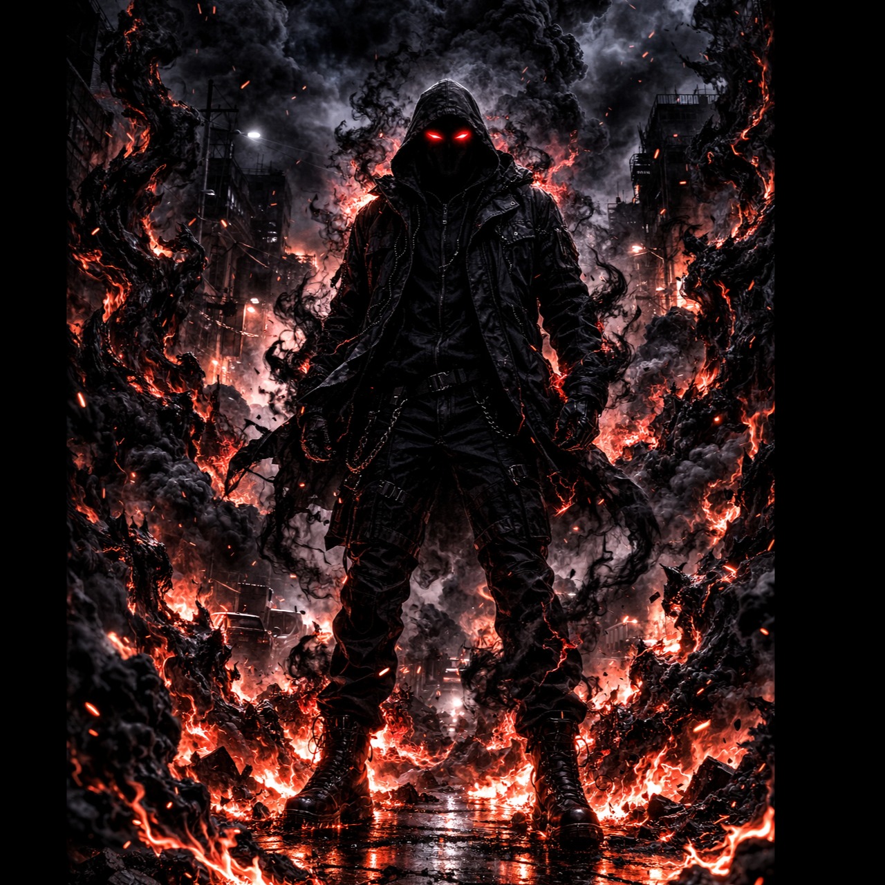 Late-night urban streets, rain-slicked neon reflections, smoke curling in the air, Male rap vocals, gritty and introspective, pauses for emphasis, occasional melodic hooks, Mood is brooding, aggressive yet reflective, balancing tension and chill, Sparse atmospheric pads, low 808s, crisp hi-hats, subtle synth textures, occasional cinematic strings or ambient FX to highlight chaos, Mid-tempo, measured flow allowing punchy rhythms and lyrical depth, Themes of obsession, self-destruction, and internal war, using metaphorical imagery like chain smoke, fire, and machine guns, Structure: dense metaphorical verses, emotive melodic hooks, minimal cinematic bridge highlighting vocal intensity, Emphasis on raw emotion, cinematic tension, dark reflective energy, and hypnotic rhythm
