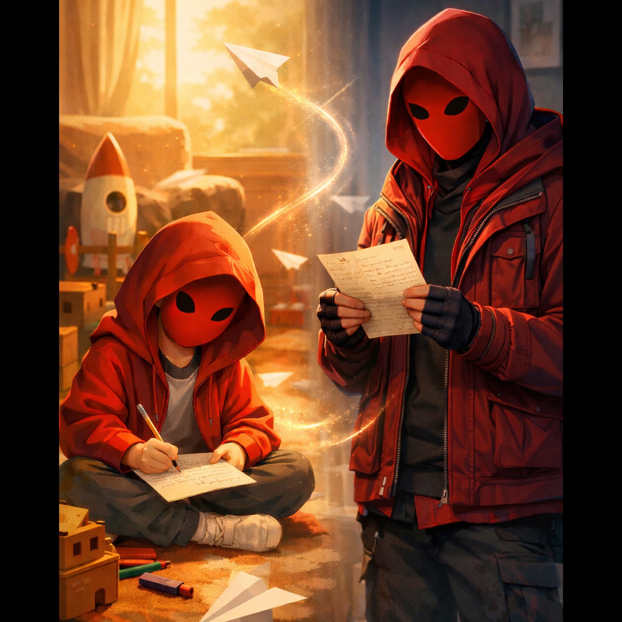 Cinematic emotional concept song structured exactly in order as written, Do NOT change lyrics, SECTION 1 (LIL R, E, D – VERSE 1 & 2 + CHORUS): Soft piano, warm ambient pads, light acoustic textures, subtle percussion, nostalgic cinematic pop, Mood hopeful, innocent, imaginative, slightly reflective, Young boy child voice, natural diary-style delivery, Child writes a time-capsule letter about astronaut dreams, friends, growing up, pets, and flying cars, Chorus is uplifting, emotional, belief-driven, SECTION 2 (R, E, D – VERSE 3 & 4 + FINAL CHORUS): Deeper cinematic soundscape with ambient bass, soft cinematic drums, synth layers, subtle piano motifs, Grown male voice, deep, raw, emotionally honest, speaking to younger self, Responds to childhood dreams with real-life perspective—friendship changes, family, home, growth, unresolved future ideas, Tone bittersweet but grounded, not sad, Tempo 80–90 BPM, Cinematic pop, emotional indie, soundtrack storytelling, Full emotional arc, ‑no heavy drums, ‑no dark tone