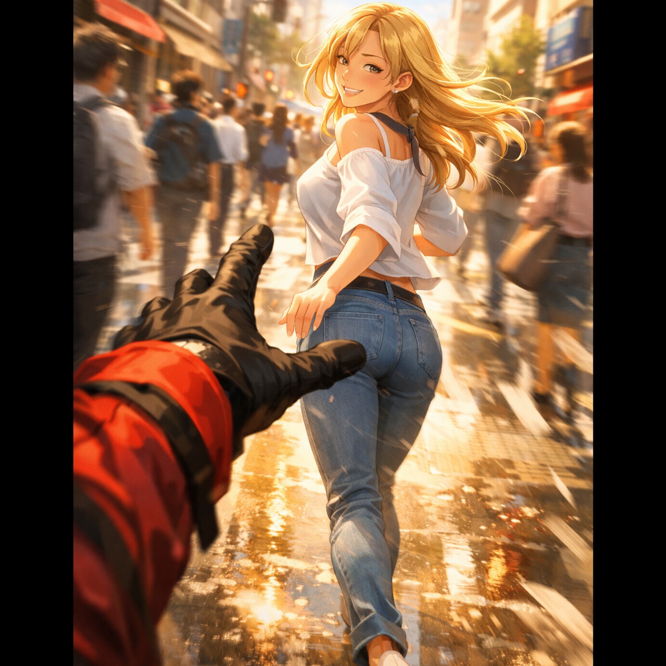 pop trap / chillwave cinematic track with hypnotic male vocals, layered harmonies, and flirty obsession, Mid-tempo production with soft 808s, crisp snares, airy hi-hats, and melodic pads, Ambient city sounds subtly layered: footsteps, chatter, distant traffic, giving a sense of a bustling street without neon or shadows, Vocals center on hypnotic admiration, swelling in choruses with layered ad-libs, Bridge drops slightly for tension, then swells in the final chorus for emotional release, Bright, cinematic, and flirty, emphasizing the “Your beauty’s a drug” hook with immersive urban energy