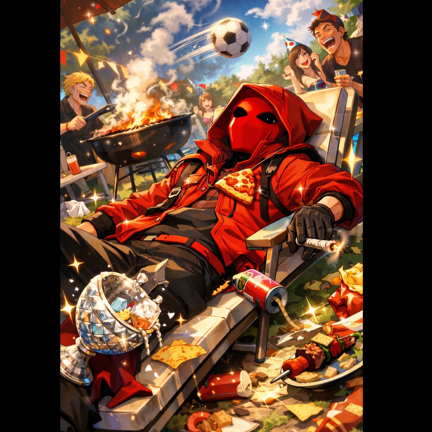 – mid-tempo comedic hip-hop/pop-rap, 100 BPM, bright major key (C or D), bouncy slap-bass groove with deep hip-hop-style 808 bass, snappy snares, hi-hats, whimsical plinky accents, occasional sound effects: sizzling BBQ, popping noises, sparkling diamond chalice, flying footballs, Male lead rap-singing hybrid vocals, alternating spoken narration (“Warning… unless you’re a professional!”, “Pass to me—I’m open!”) and melodic exaggerated lines, cartoonish inflection, pauses for comedic timing, occasional crowd chants on final chorus, Lyrics are absurd, satirical storytelling of a disastrous barbecue, out-of-body chaos, mishaps, and over-the-top “never again” regret, turning failure into comedy, Structure: intro (spoken), verse 1 (story begins), chorus (catchy, chantable), verse 2 (absurdity escalates), pre-chorus (energy lift), chorus repeat, bridge (reflective/comedic), final chorus (layered, big, epic comedy), Playful, absurd, highly replayable, comedic storytelling, viral appeal