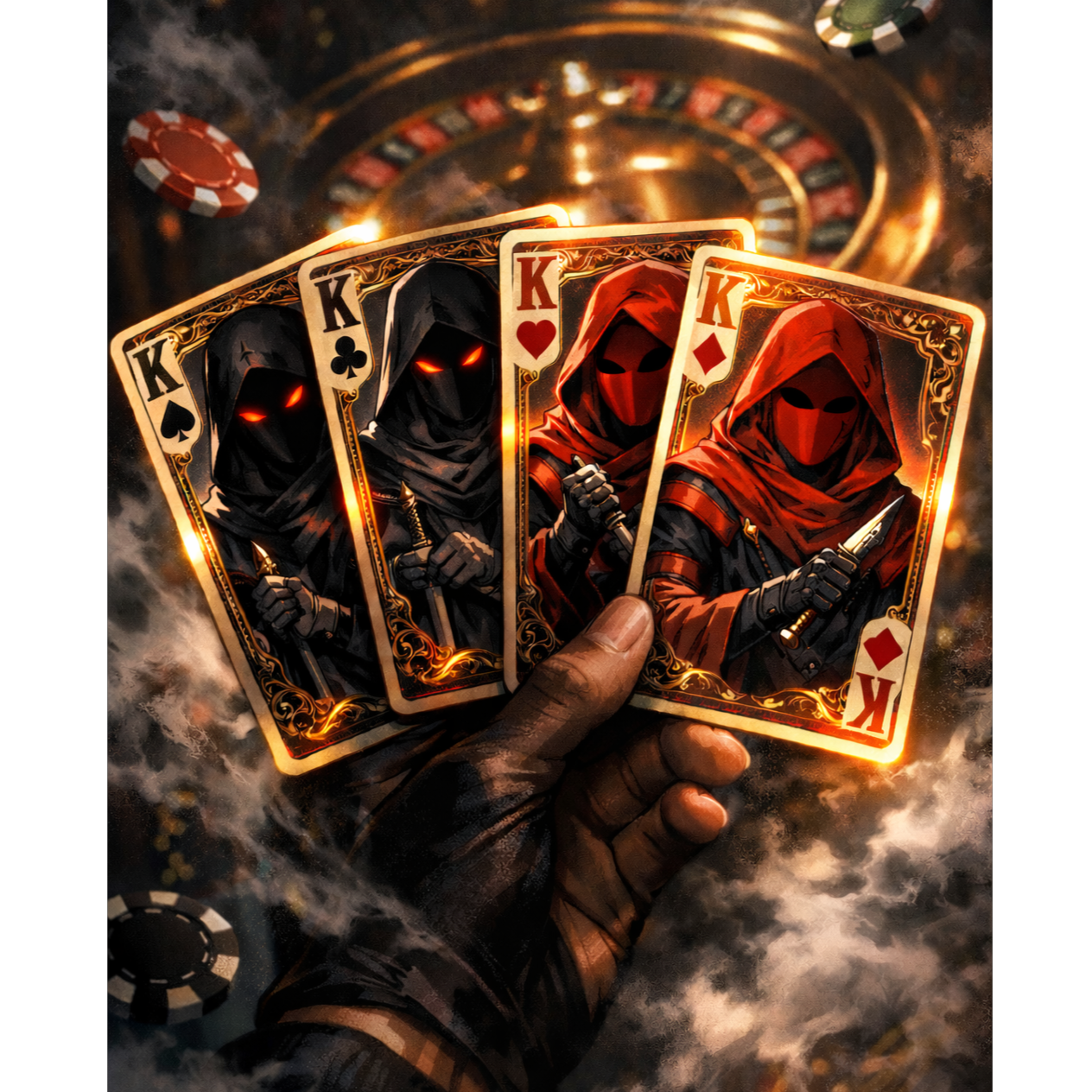 Dark UK drill / rap trap anthem, 100–105 BPM, blending sliding 808s, syncopated hi-hats, sharp snares, and minimal yet cinematic orchestral layers (strings, eerie pads) to create tension and menace, Vocals delivered in cold, monotone poker-face style during verses, with explosive, raspy, layered choruses conveying arrogance and calculated bluffing, Deck-of-cards, chips, dice, and roulette sound effects layered subtly to emphasize high-stakes gambling and chaos, Atmosphere is stylish, villainous, sarcastic, cinematic, highlighting a foolhardy player pretending control while clever observers see the truth, Whispered ad-libs, distorted echoes, and risers heighten suspense, giving the track UK drill aggression fused with cinematic trap intensity, Perfect for dark, high-stakes, villainous energy with a sharp, sarcastic edge