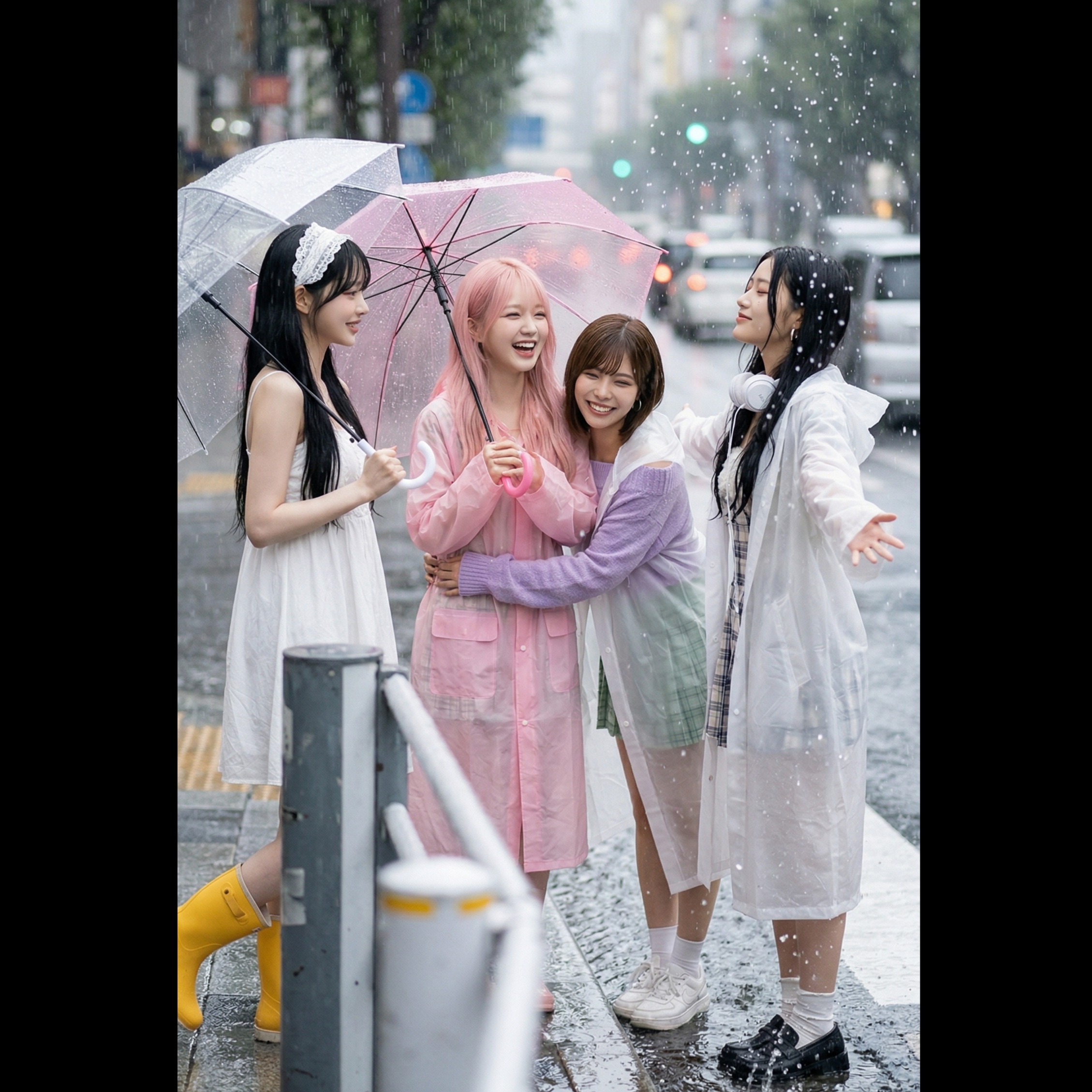 K-indie pop + bubbly R&B + lo-fi hip hop + chillhop + ambient nature soundscape, kalimba lead, ukulele rhythm, soft electric piano, light pluck synth, field recording rain, water drops foley, vinyl crackle texture, finger snap + hand clap percussion, soft sub bass, dreamy, floaty, playful yet emotional, bittersweet healing vibe, Korean-English bilingual female vocal, girl group harmony, whisper layer