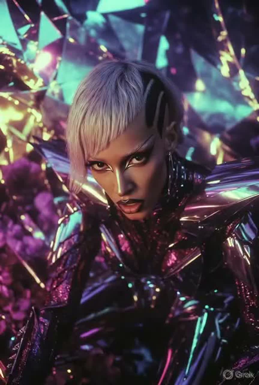 Pop Rap, R&B fusion, Trap-influenced beats, Playful and confident female vocals, Rhythmic flow with melodic hooks, Danceable mid-to-upbeat tempo, Slick digital production, Funk and disco undertones, Experimental sound design, Catchy choruses, Modern pop polish, Sensual and witty mood, female, whispered falsetto, smoky, sassy, nasal soprano voice, ‑afrofuturism
