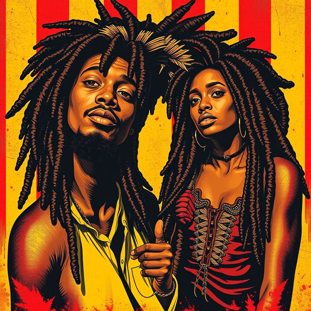 reggae, slow ballad, piano, retrospective, Love emotional Melodic male and female voice, in love together, laid-back, reggae roots, 808 beat, raggamuffin, cyberpunk edm, jamaican accent, chill rap, hip hop