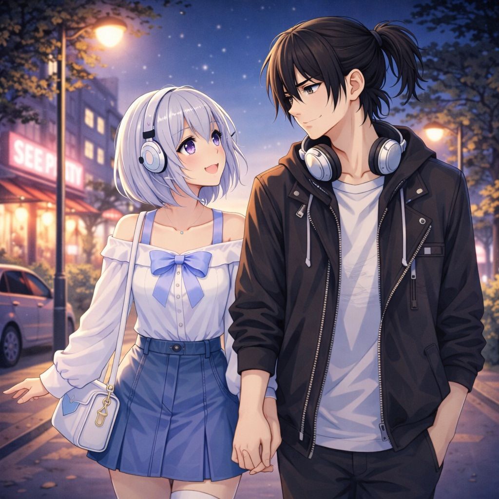 A city pop song about two people walking together at night, Soft streetlights, quiet city air, and a slow, comfortable pace, The main vocal is androgynous / neutral, calm and intimate, A female vocal supports with gentle harmonies and responses, No dramatic climax, no rush — just warmth, distance, and shared silence, Feels like headphones on during a late-night walk, Vocal Style: