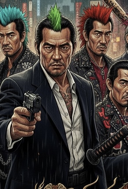 A visceral, high-contrast cinematic still, A young Japanese punk, face contorted in a desperate scream, clutches a vintage microphone, He's in a claustrophobic, rain-soaked Shinjuku alley, circa 1970s, Cheap neon signs cast harsh red and blue light on wet concrete, In the background, shadowy figures of yakuza in dark suits smoke, their faces cold, The air feels thick with the smell of rain, cigarettes, and the metallic tang of blood, This image captures raw 8-beat punk energy, nihilism, and the desperate cry of a "sewer rat" trapped in a brutal world of betrayal, rejecting its hollow codes of honor