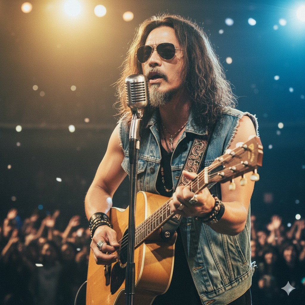 An Epic Japanese Folk-Rock Anthem, The Vocal Style Is A Profoundly Passionate, Raw, And Gritty Male Vocal, Often Shouting With A Desperate Cry, The Voice Is Husky, Full Of Conviction And Fighting Spirit, The Music Is Driven By An Aggressive, Percussive Acoustic Guitar And A Wailing Blues Harmonica, The Rhythm Is A Heavy, Driving Drum Beat And A Solid Bassline, A Raw, Overdriven Electric Guitar Adds Powerful Riffs And An Emotional Solo, The Song Must Build From A Sparse, Tense Verse To An Explosive, Anthemic Singalong Chorus, Evoking Themes Of Justice, Inner Struggle, And A Passionate Cry For Life