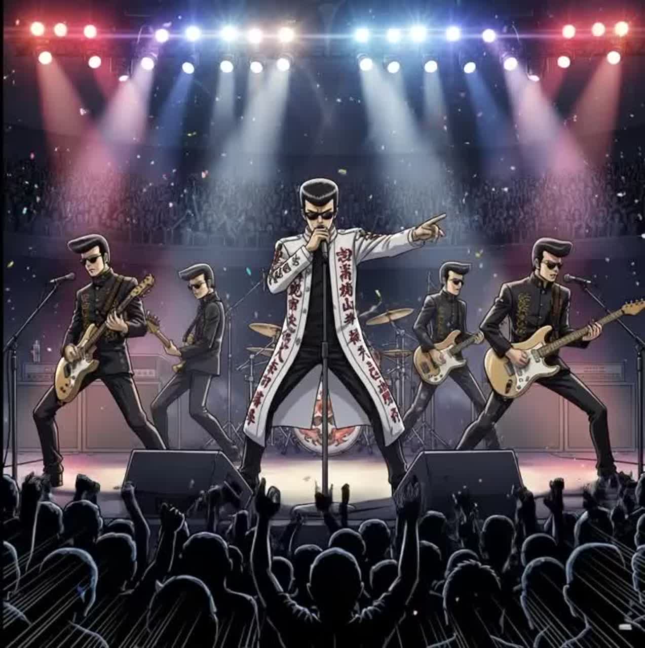 Create a high-energy Japanese yankii rock anthem with biker-glam attitude, Start with ~6 seconds of bosozoku catcalls: whistles, “Oi! Oi!” shouts, handclaps, and revving motorcycle engines, then slam into fast rock (150 BPM, key E minor), Crunchy twin guitars, loud tom-driven drums, thick bass, optional sax stabs, slapback male lead vocal with swagger, Language: Japanese, Theme: rebellious night ride, neon streets, gleaming sunglasses, outlaw romance, Structure: Intro (catcalls), Verse, Pre-Chorus, big anthemic Chorus (call-and vocals), short guitar solo, breakdown with chants, final double Chorus, outro engine revs, Mix: warm analog, punchy snare, chorus guitars