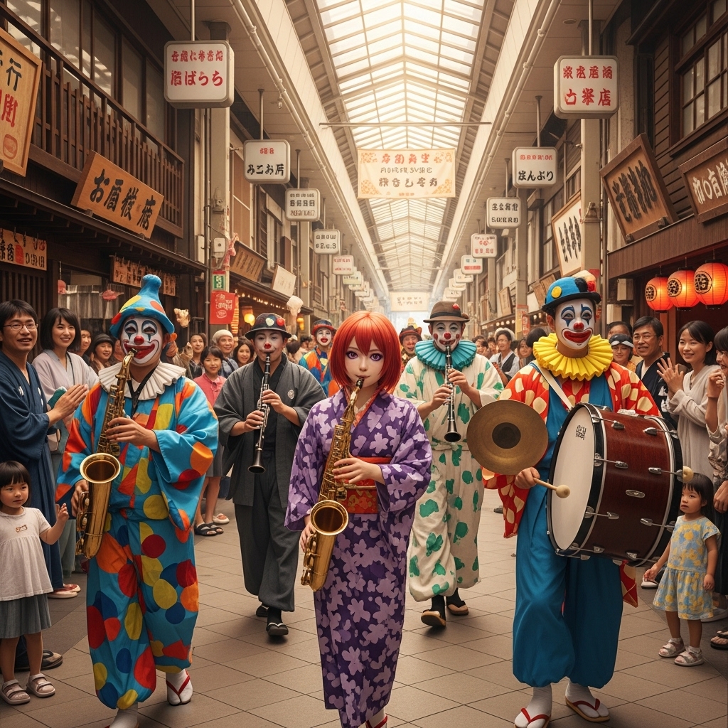 ego search, experimental japanese chindon-ya, chaotic street marching band, dissonant saxophone, off-key clarinet, loud kane bell, clashing percussion, chindon drum, noisy texture, avant-garde jazz fusion, manic energy, grotesque carnival atmosphere, uneven rhythm, raw acoustic sound, intense cacophony, festive madness