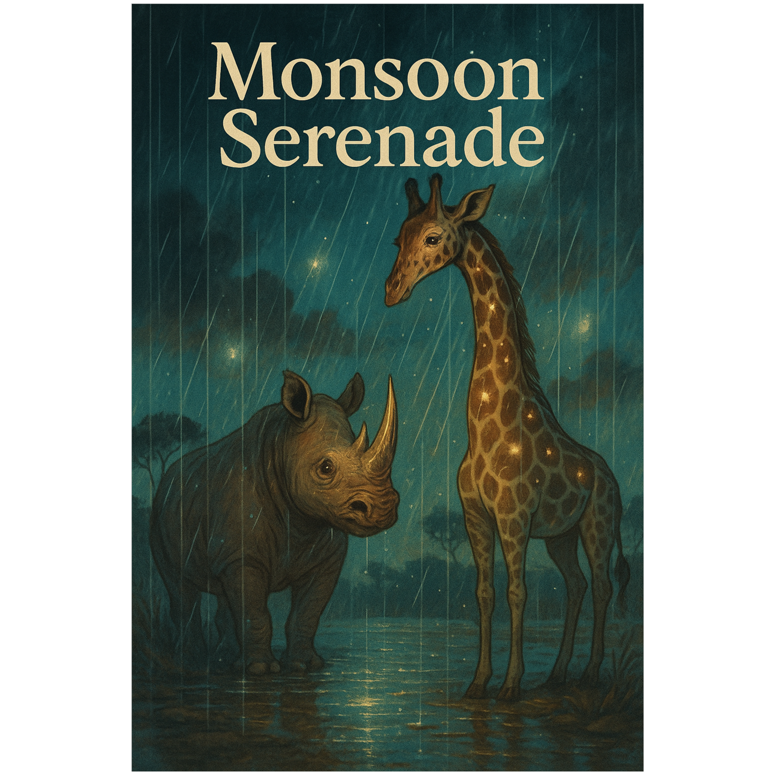 A fantasy baroque pop and tribal electro-swing fusion, soaked in cinematic rain jazz textures and whimsical percussion, The instrumentation includes pizzicato strings, slap bass, celesta sparkles, and thunder-crack FX weaving through tribal drums and lo-fi ambient rain samples, Vocals shift between theatrical male crooning and airy choral harmonies, layered with spoken word echoes and whispered poetic interludes, The production evolves with harmonic surprises and melodic inversions, evoking a surreal wildlife fairytale during an ecstatic downpour, Emotive, peculiar, and wondrous