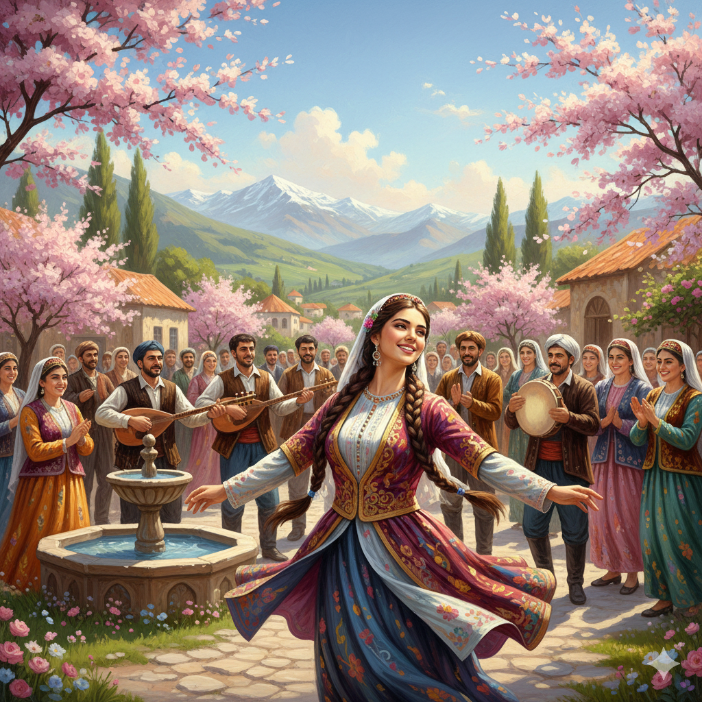 An upbeat Azerbaijani folk song opens with energetic saz picking the main melody, joined by lively hand percussion driving a traditional dance rhythm, Kamancheh weaves bright, ornamental phrases between verses, while duduk softly colors the background with warmth, A lively, expressive female vocal soars above, infusing each verse and the chorus with vibrant embellishments and hints of joyful laughter, The structure cycles through three verses and a catchy, repeated chorus, the ensemble evoking the spirit of spring and a cheerful village celebration
