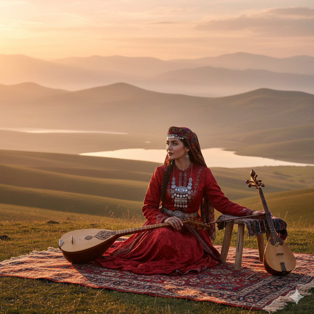 A slow-to-medium tempo Turkmen folk piece opens with expressive solo female vocals, clear and vibrant, adorned with natural vibrato and intricate melodic ornamentation, Accompanied only by dutar and gijak interweaving gentle arpeggios, karnay softly accenting transitions, and sparse hand percussion, Verses and chorus flow with repeated motifs and subtle dynamic shifts, delivering an acoustic, pastoral, sunrise-evoking texture, Purely acoustic, culturally authentic, with intimate, emotive delivery and a high-quality balance of traditional instruments, maintaining an organic atmosphere throughout