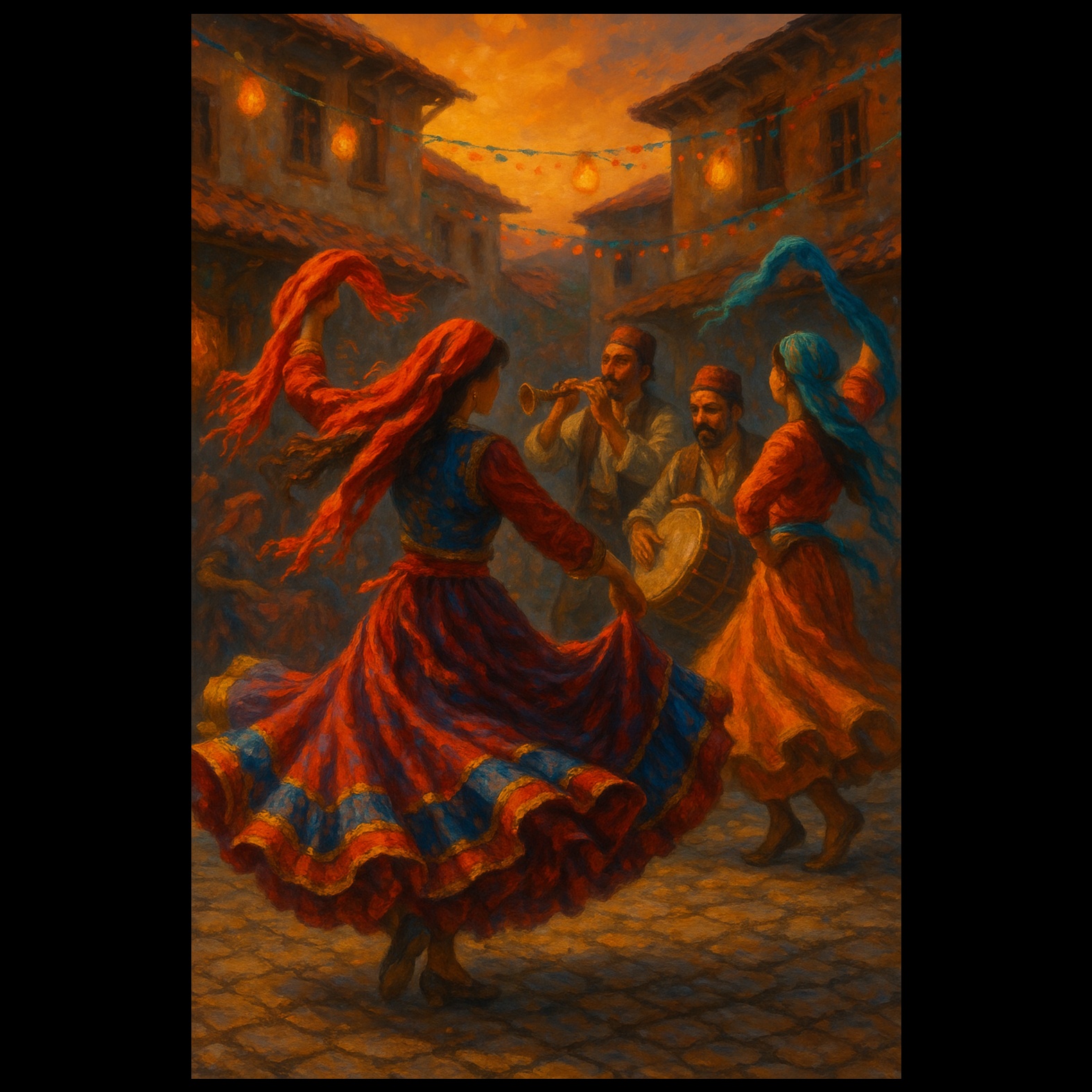 A lively Turkish folk tune, led by rhythmic bağlama riffs interweaving with energetic darbuka patterns, Percussive accents and dynamic tempo drive the piece, as melodic flourishes from traditional wind or string instruments add color, The arrangement swells with group vocals and handclaps