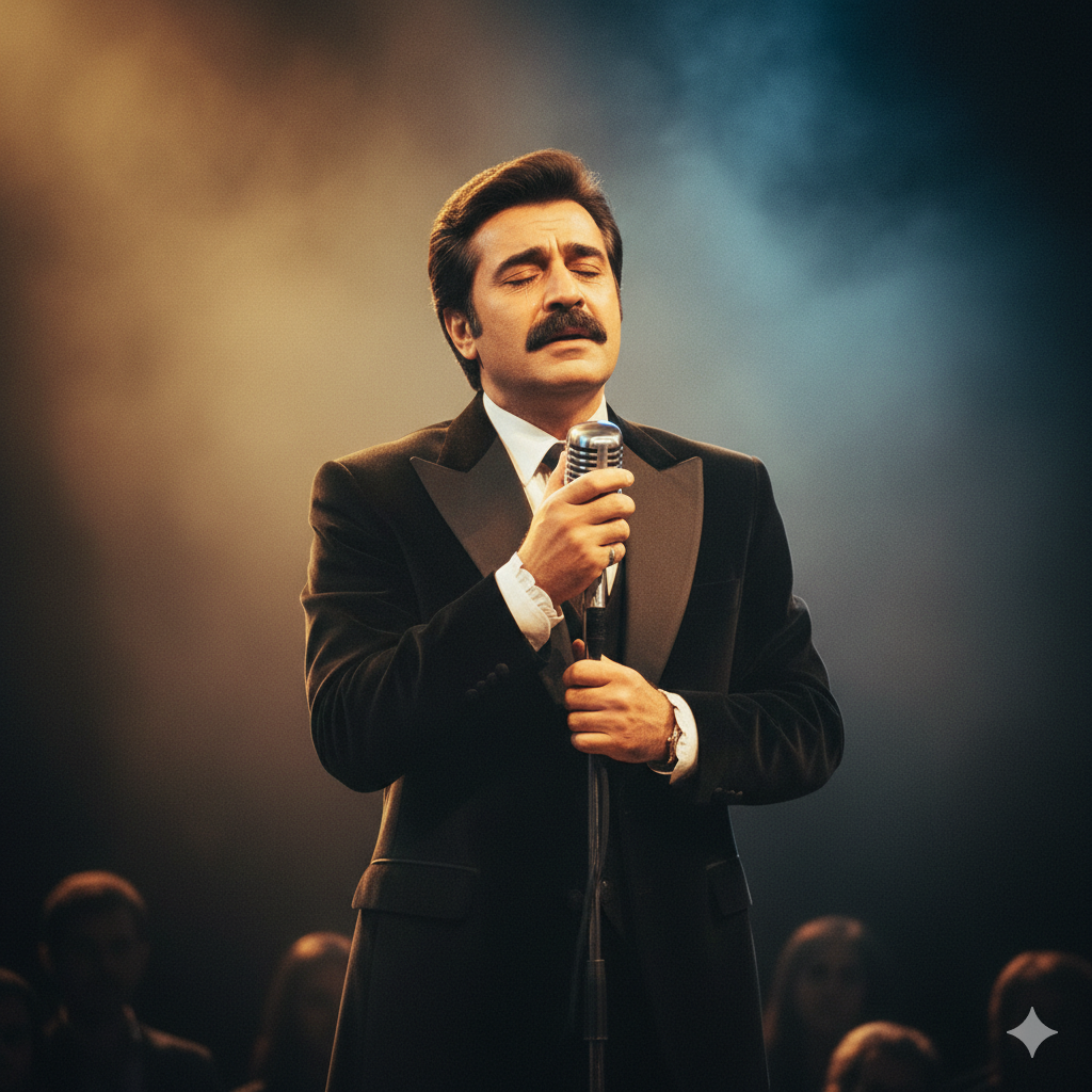 A deeply emotional Turkish classical love ballad in the nostalgic style of Zeki Müren, similar to "Yeşil Gözlerine Hasret Kaldım, " The song is composed in the Kürdilihicazkar makam, featuring lush string sections, expressive qanun and oud, and a passionate vocal performance full of longing and heartache, The rhythm is slow and dramatic (Düyek), creating a theatrical and melancholic atmosphere, Perfect for evoking the golden era of mid-20th century Turkish art music