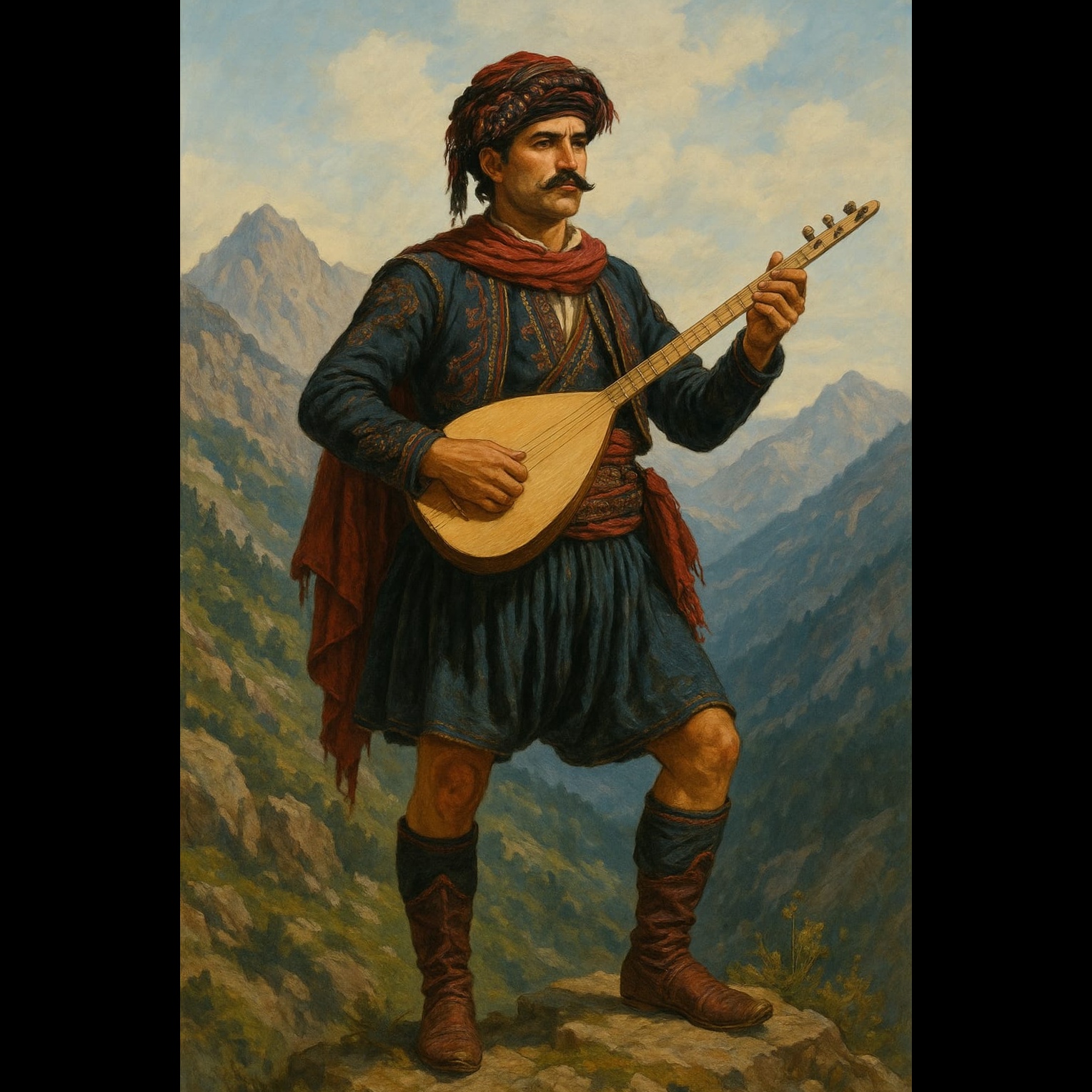 Style: Epic Turkish folk ballad with a steady, march-like rhythm in the style of Hasan Mutlucan, Proud, deep male voice with clear, rhythmic delivery, Tempo: Moderate-slow (72–80 BPM), in 4/4, Use traditional Turkish instruments only: bağlama (lead melody), davul (steady rhythm), kaval (optional), and subtle strings, No electronic sounds, The tone should be heroic and grounded, like a folk warrior's anthem echoing through the mountains, Language: Turkish