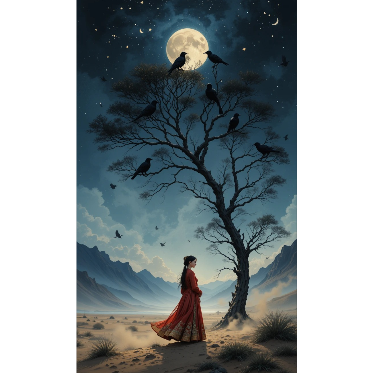 Create a soulful interpretation of the Uyghur folk classic “Qara Qara Qaghilar” (Black Crows), The arrangement should capture the essence of Uyghur traditional music with a warm, heartfelt female vocal, expressive and emotional, carrying tones of longing and tenderness, Use raw, folk-style ornamentation with natural vibrato and subtle melismatic phrases, Instrumentation: the rawap and dutar provide plucked melodic accompaniment, tambur adds depth, while hand percussion (dap/ frame drum) creates a steady, earthy pulse, Incorporate subtle strings to enhance the emotional atmosphere, The tempo should be moderate, slightly free-flowing, evoking the feel of an open valley with wind and distant mountains, The mix should feel intimate and acoustic, as if performed in a traditional gathering, with natural reverb and space, The overall mood: nostalgic, yearning, deeply human, honoring Uyghur folk tradition